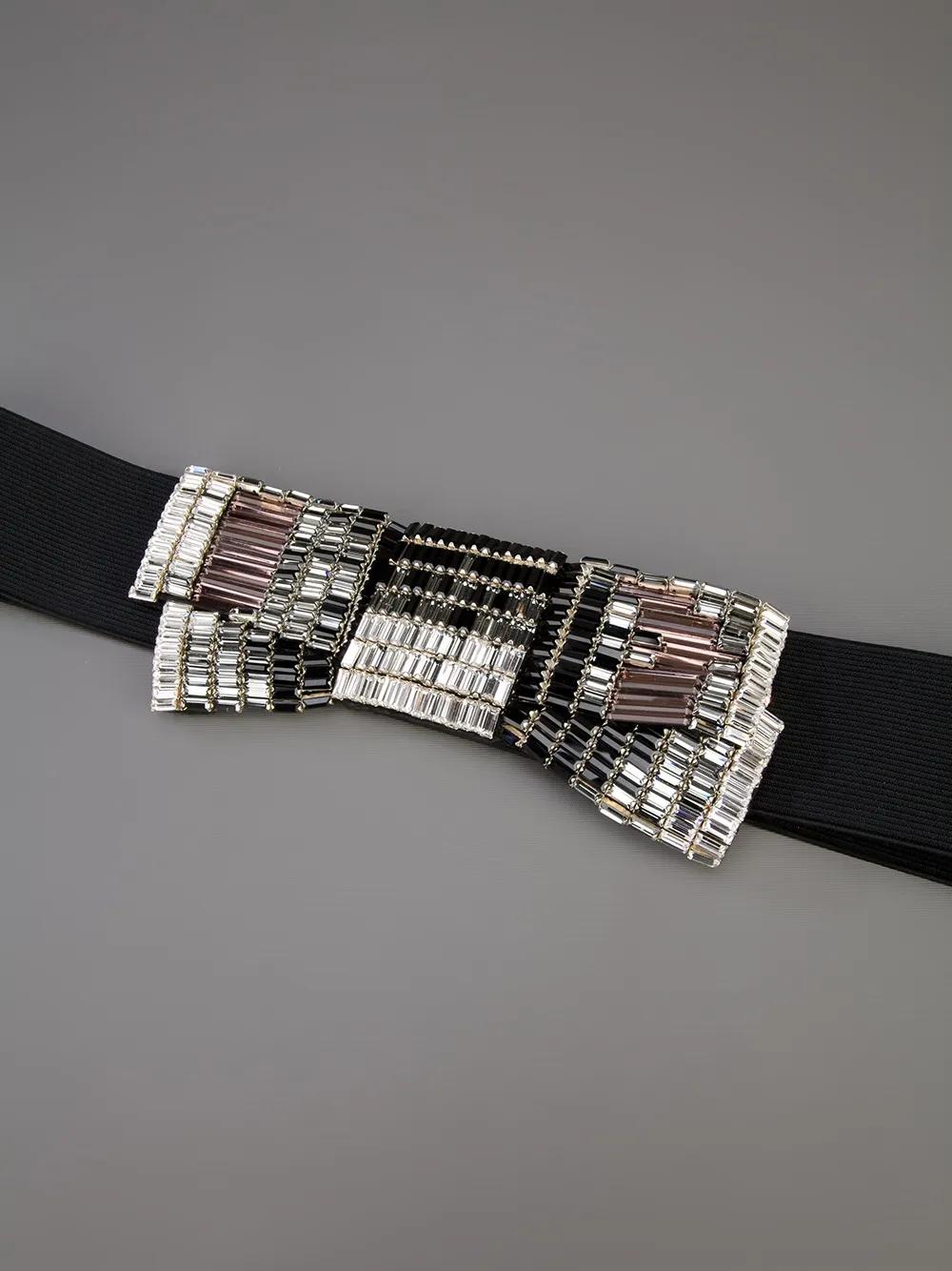 Black headband from Lanvin featuring a clear and silver-tone glass beaded bow motif to the front and a black elasticated band.