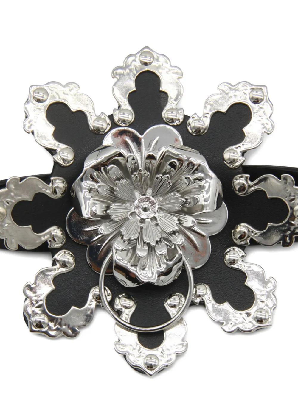 black leather silver-tone flower flower embellishment ring detail buckle fastening