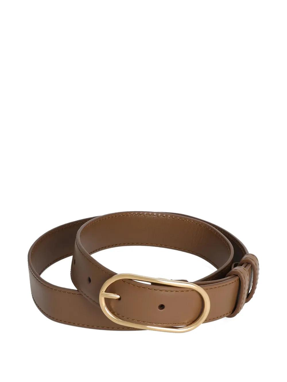 brown leather oval buckle gold-tone buckle simple design subtle stitching