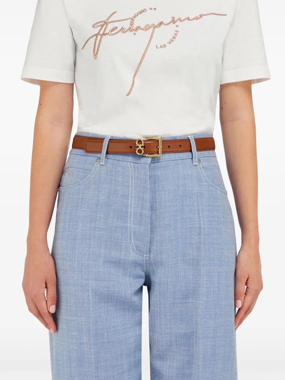 cognac brown calf leather smooth grain Gancini plaque front buckle fastening punched holes flat tip adjustable fit