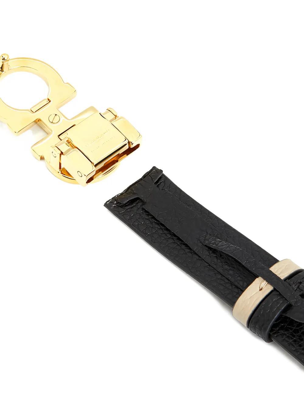 beige black calf leather smooth grain reversible pin-buckle fastening Gancini buckle engraved logo punched holes belt loops adjustable fit