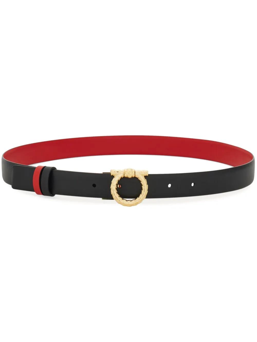 black red calf leather smooth grain reversible pin-buckle fastening Gancini buckle punched holes belt loops adjustable fit