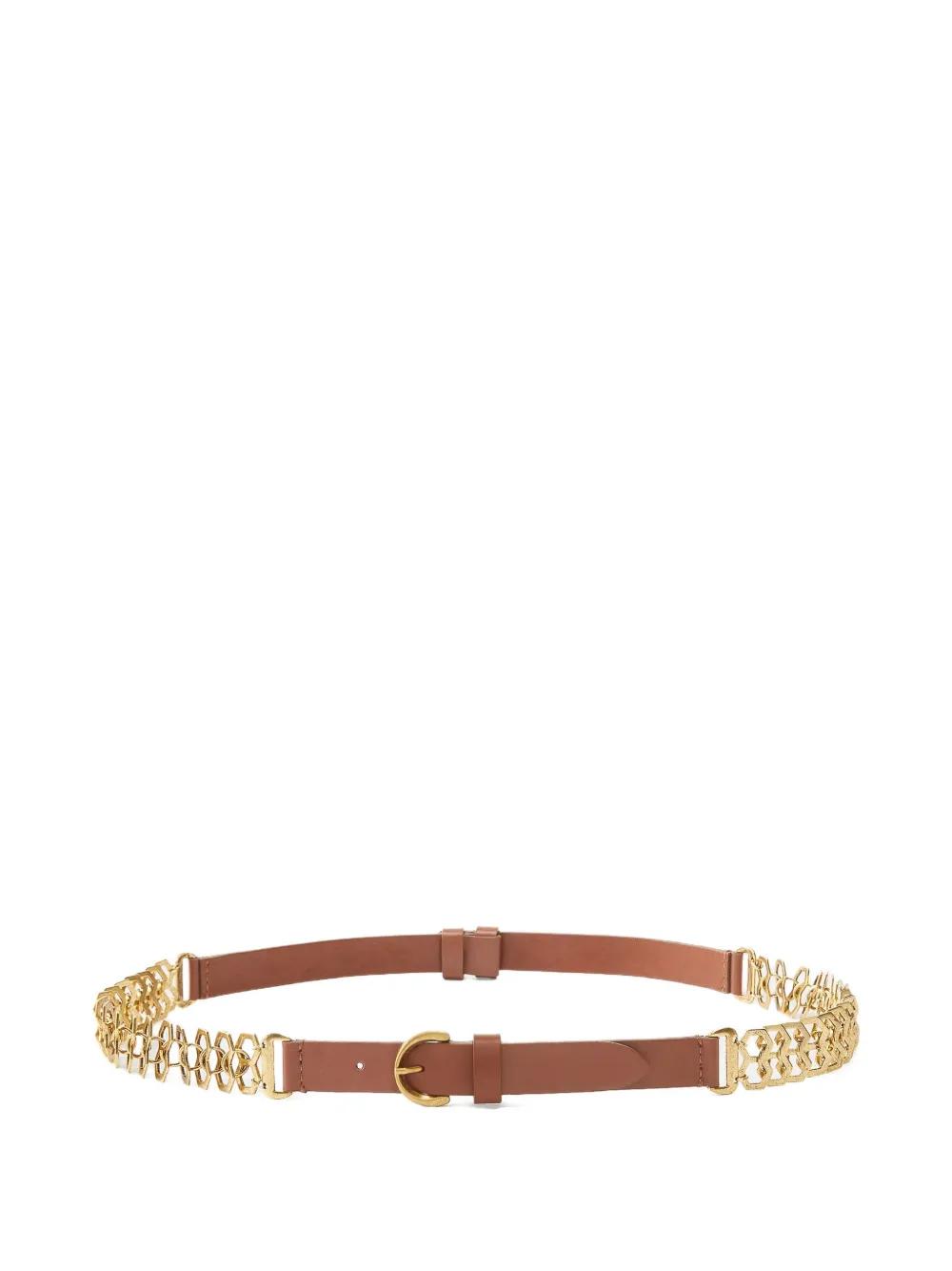 brown leather belt chain detail buckle fastening adjustable length