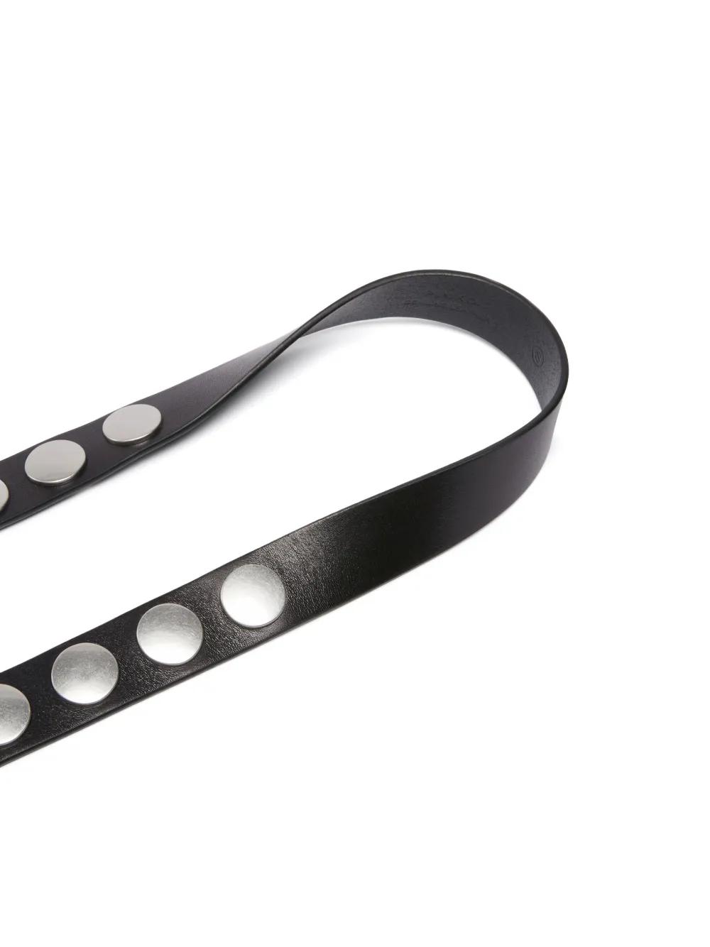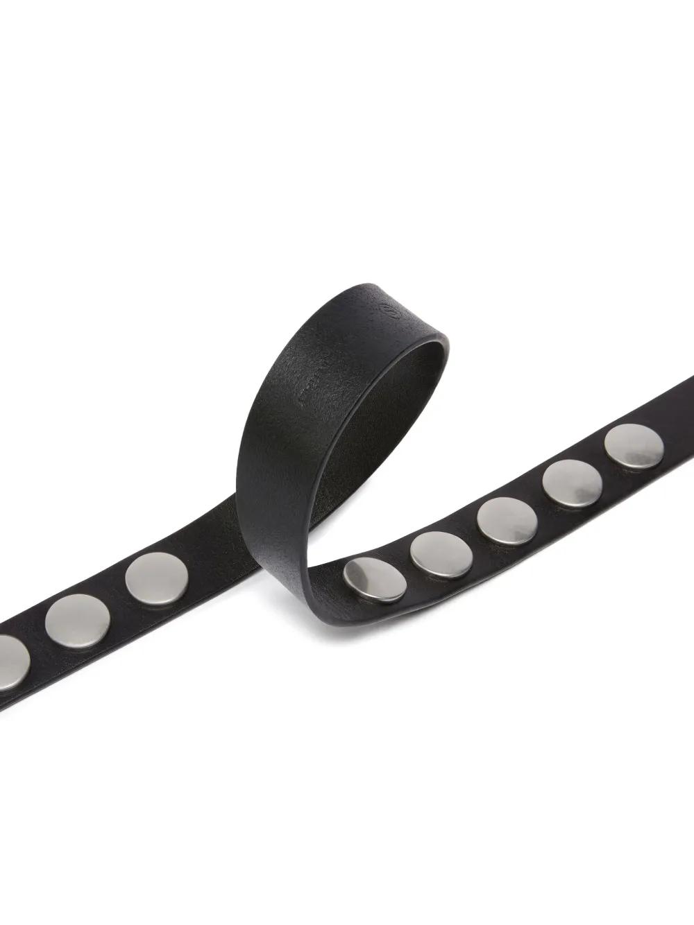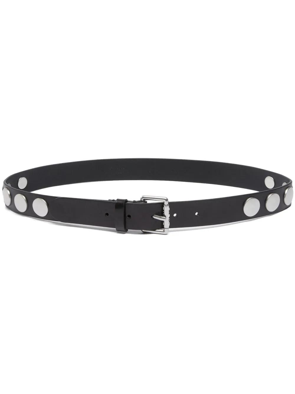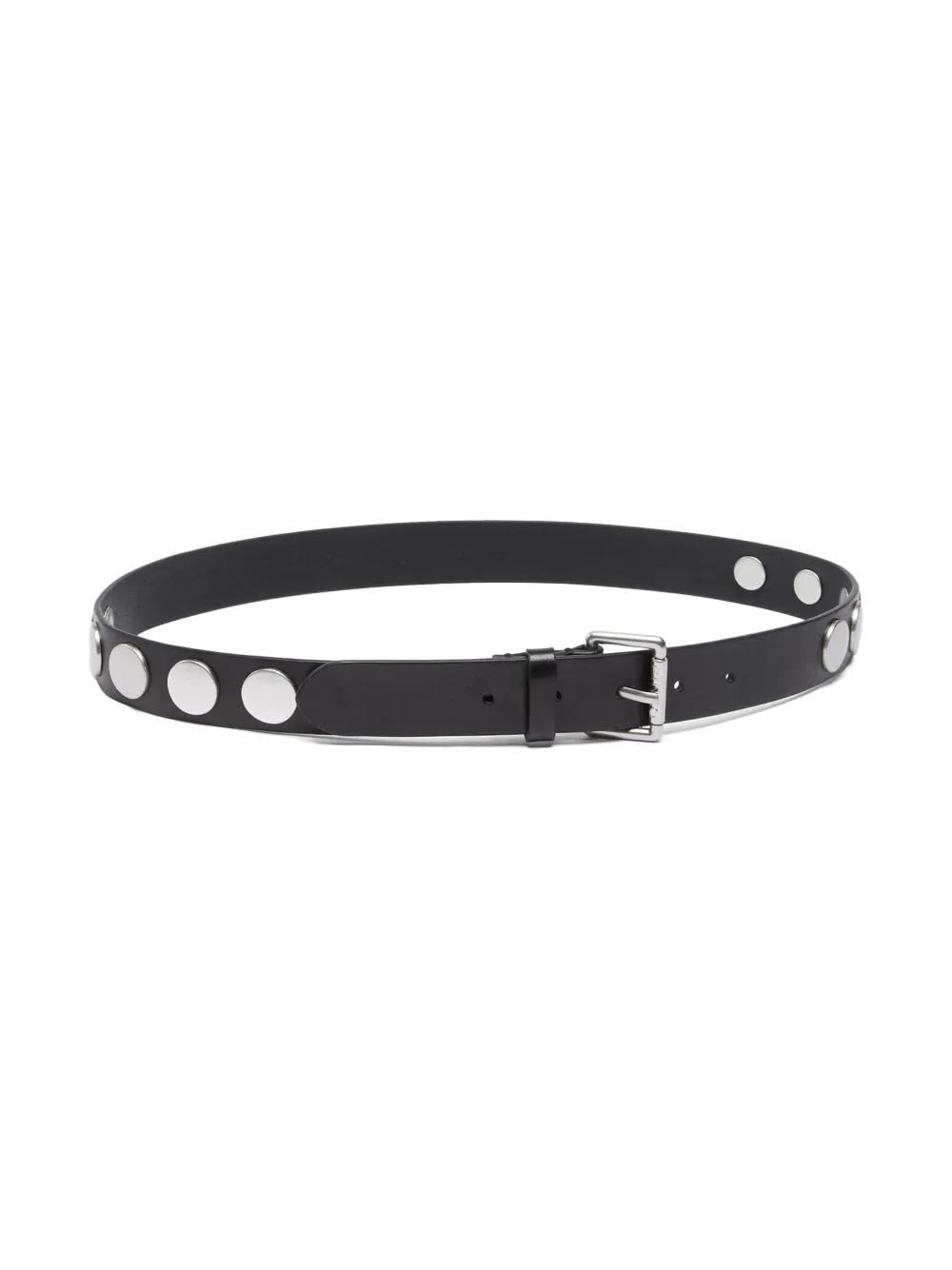 black smooth grain silver-tone stud embellishment silver-tone buckle fastening punched holes round tip adjustable fit