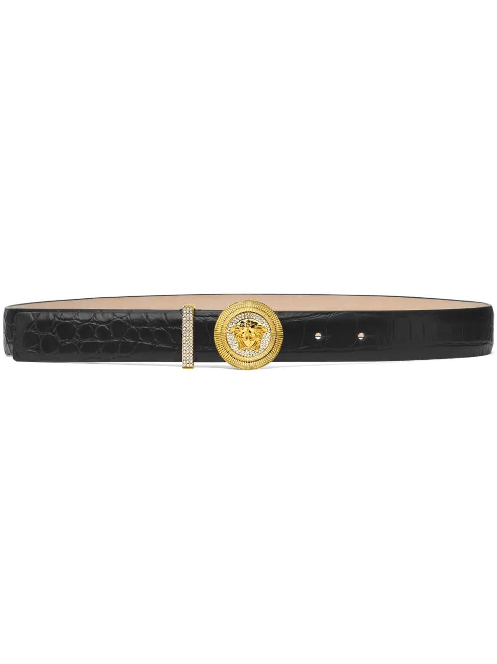 black calf leather embossed crocodile effect Medusa Head motif signature Greca detailing adjustable fit punch-hole detailing mixed-tone hardware