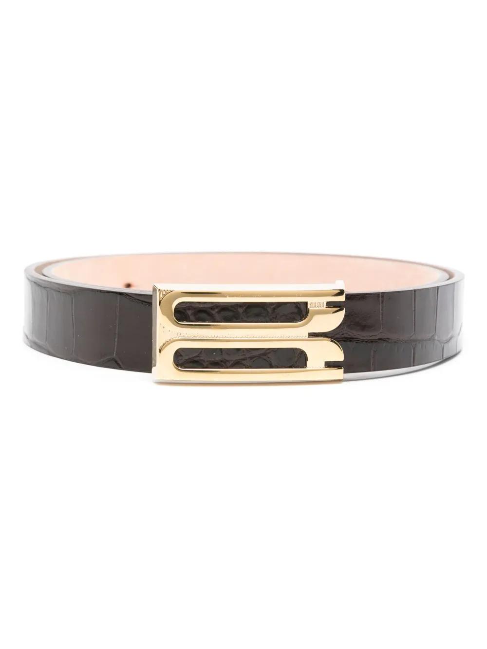 coffee brown leather embossed crocodile effect punched holes adjustable fit gold-tone hardware logo-buckle fastening