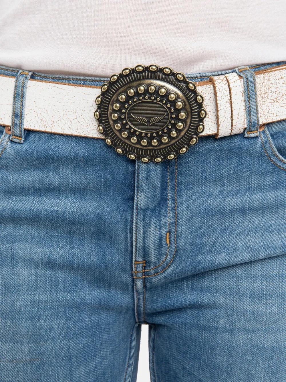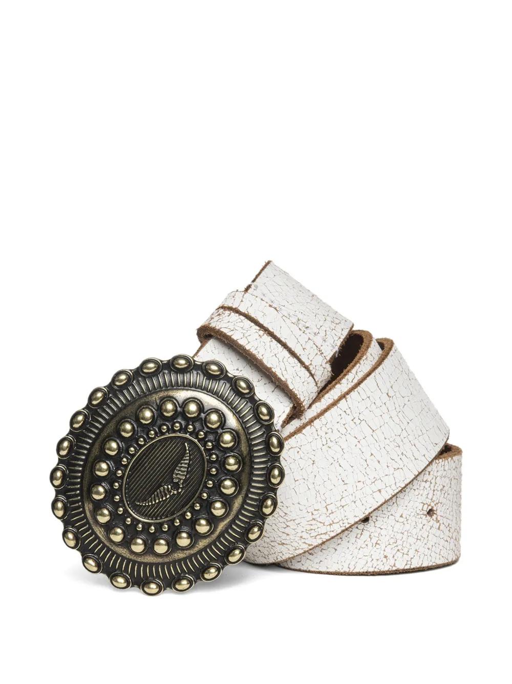 white buckle fastening distressed finish embossed logo punched holes adjustable fit