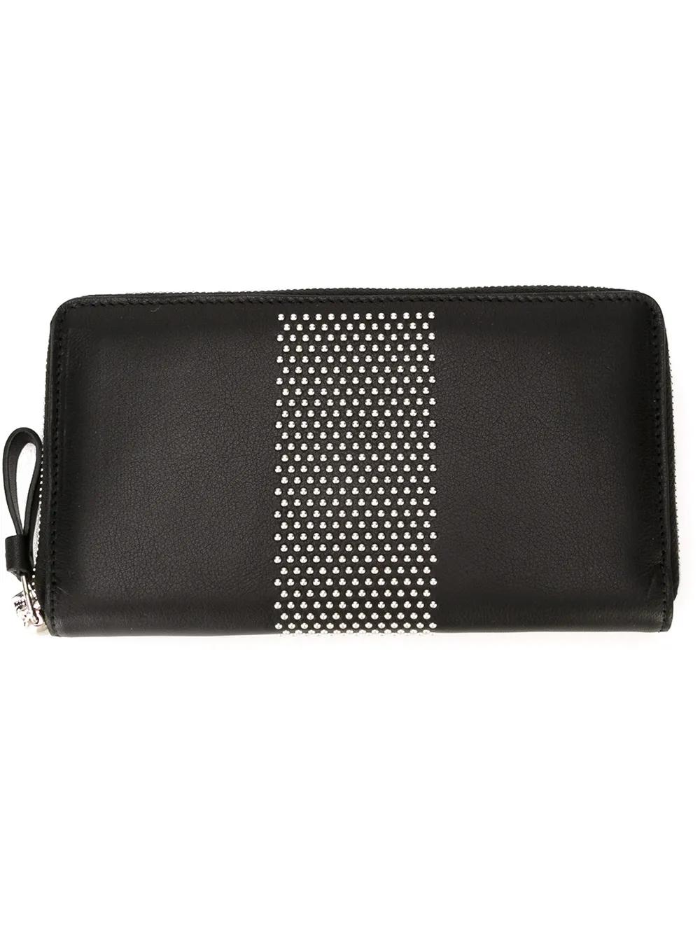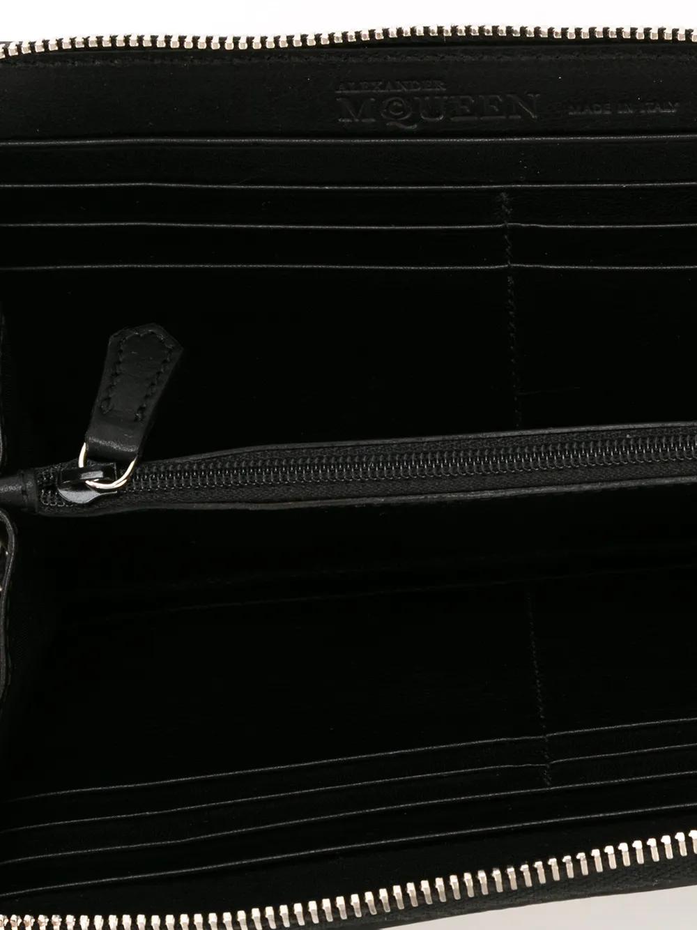 Black calf leather wallet from Alexander McQueen featuring silver-tone stud detailing, a zip fastening, multiple interior card slots and an internal zipped pocket.