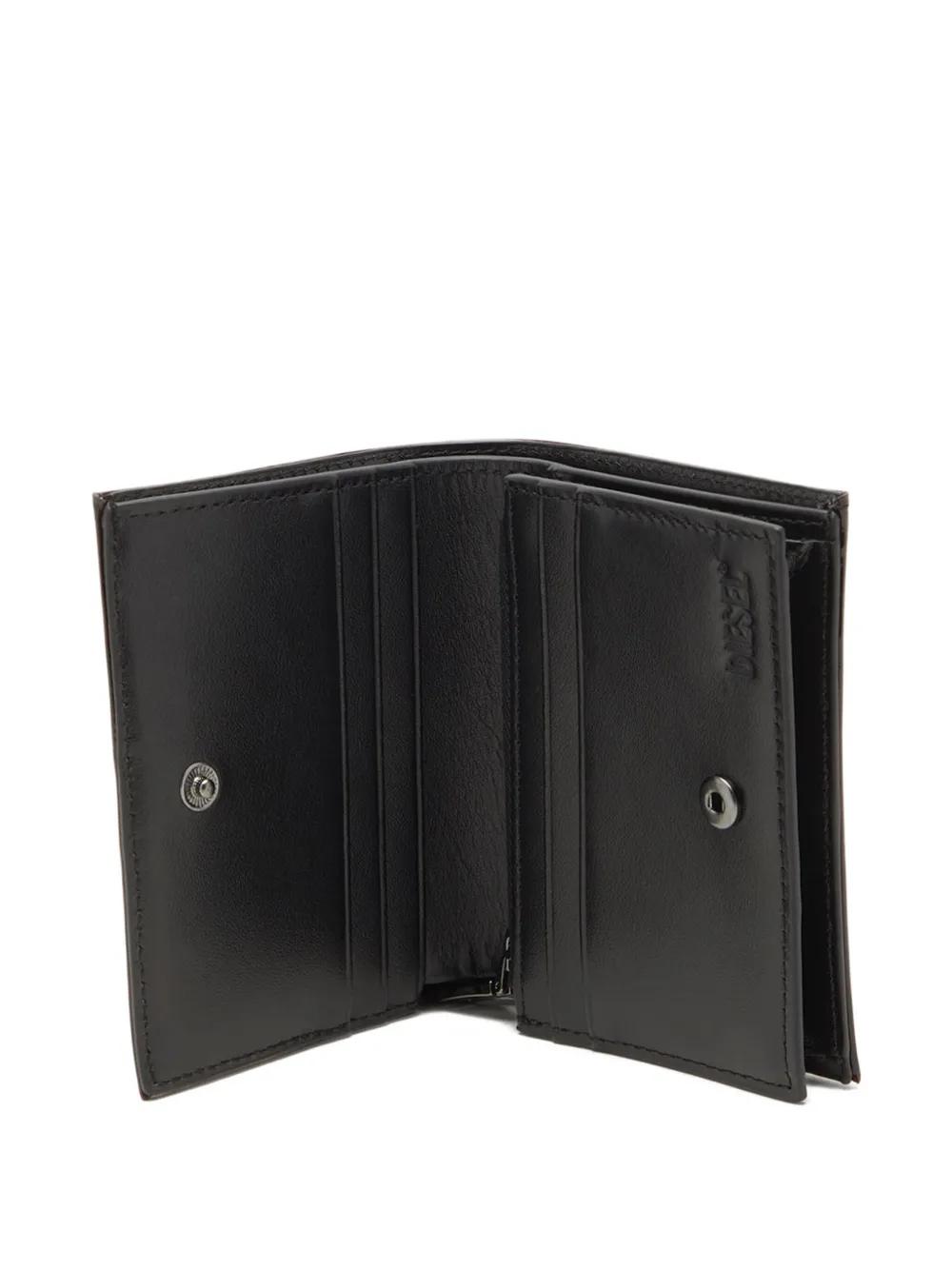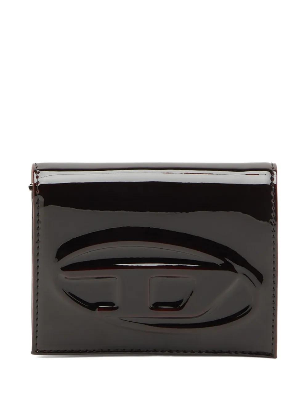 dark red patent finish embossed logo bi-fold design multiple card slots snap button closure
