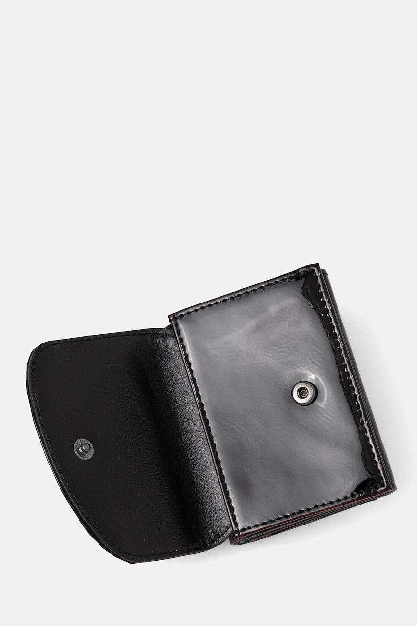 - Zapięcie na zatrzask. - Przegroda na banknoty. - Liczba przegródek na karty: 2. - Kieszeń na bilon zapinana na zatrzask. - Wymiary: 7 x 10 cm. - Model zapakowany w pudełko firmowe.