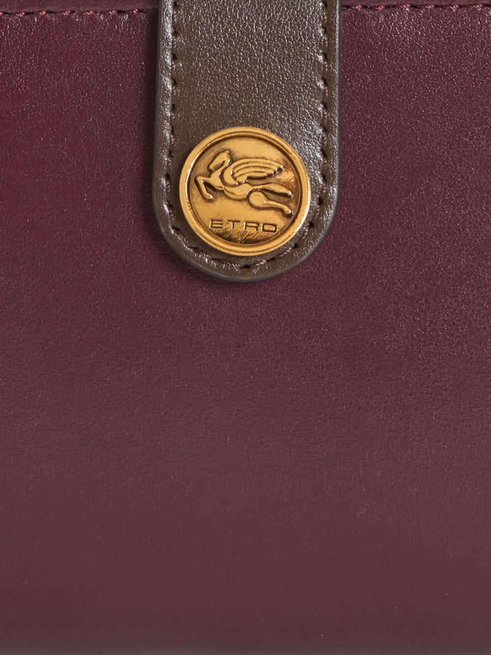 burgundy leather construction button fastening zip fastening multiple card slots embossed logo