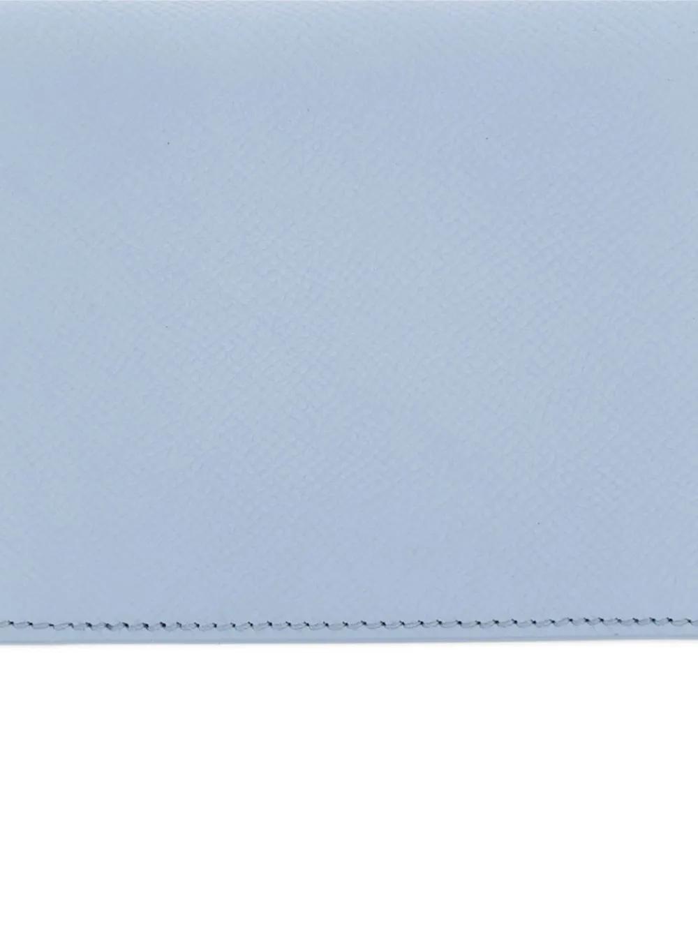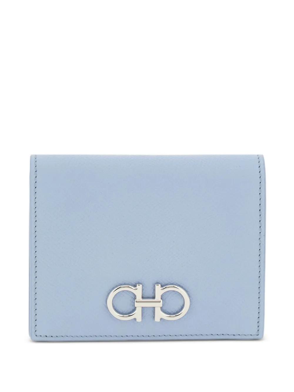 washed denim grainy texture Gancini buckle bill compartments slit pockets snap button coin pocket