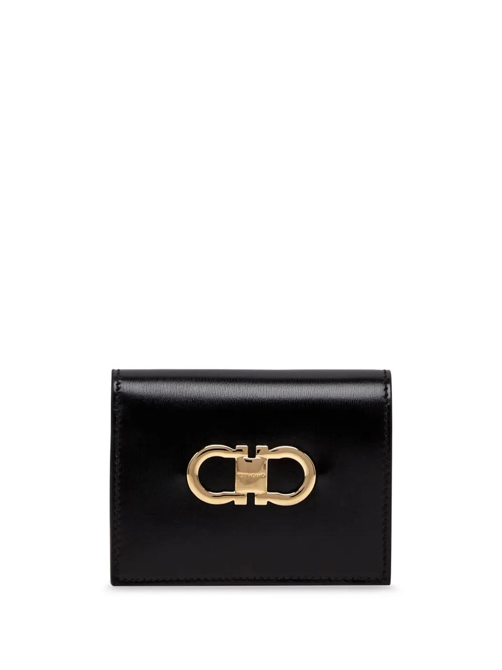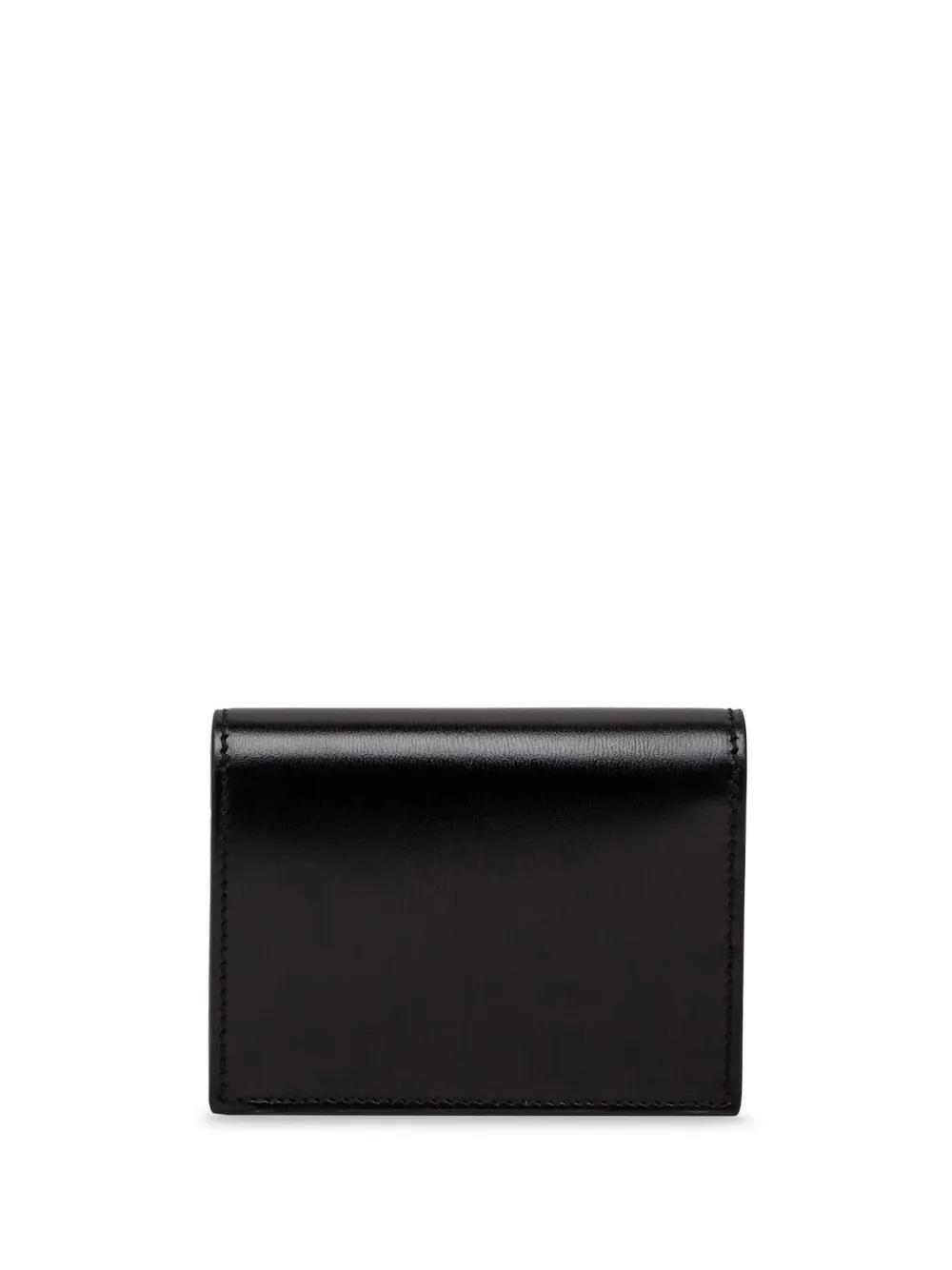 black calf leather bi-fold design gold-tone logo plaque press-stud fastening contrast lining internal logo stamp internal card slots