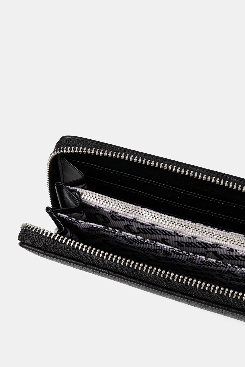 - Zapięcie na suwak. - Kieszeń na bilon zapinana na zamek. - Przegrody na banknoty. - Liczba przegródek na karty: 8. - Model zapakowany w pudełko firmowe. - Wymiary: 10 x 19,5 cm.