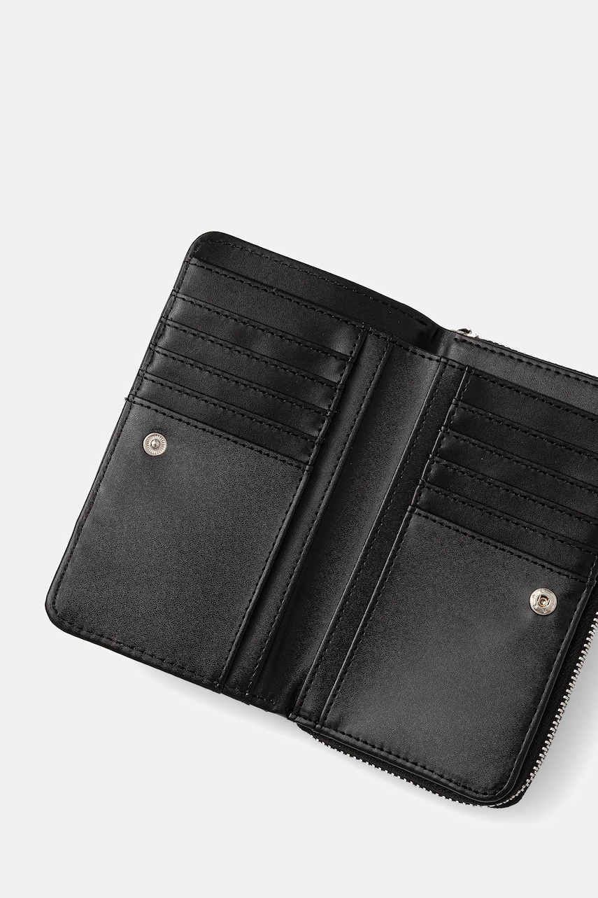 - Zapięcie na zatrzask. - Dwie kieszenie na bilon zapinane na suwak. - Liczba przegródek na karty: 10. - Wymiary: 16 x 10 x 3 cm.