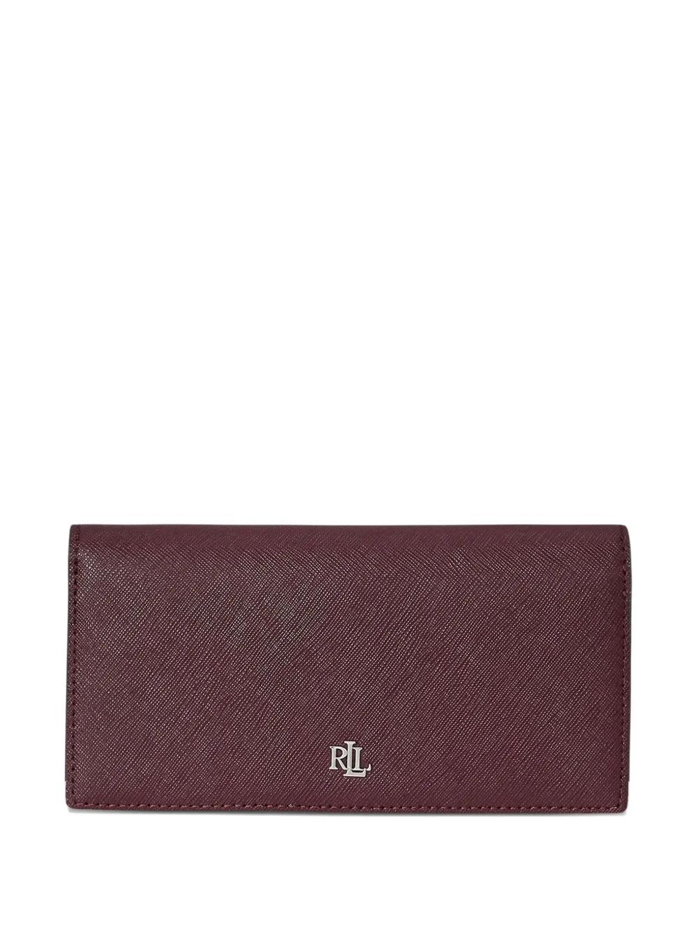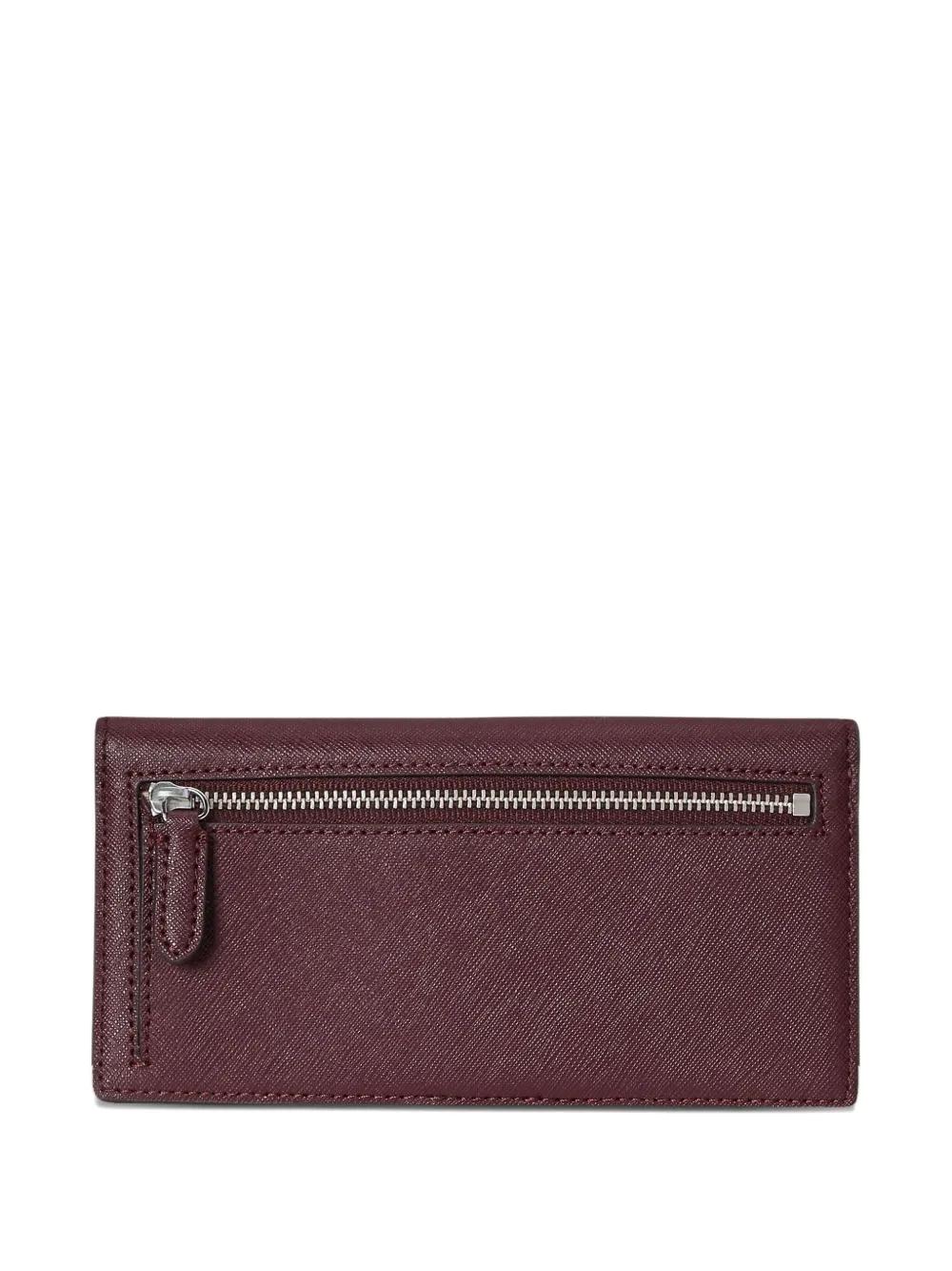 dark garnet red leather logo detail exterior zip pocket snap fastening multiple internal card slots