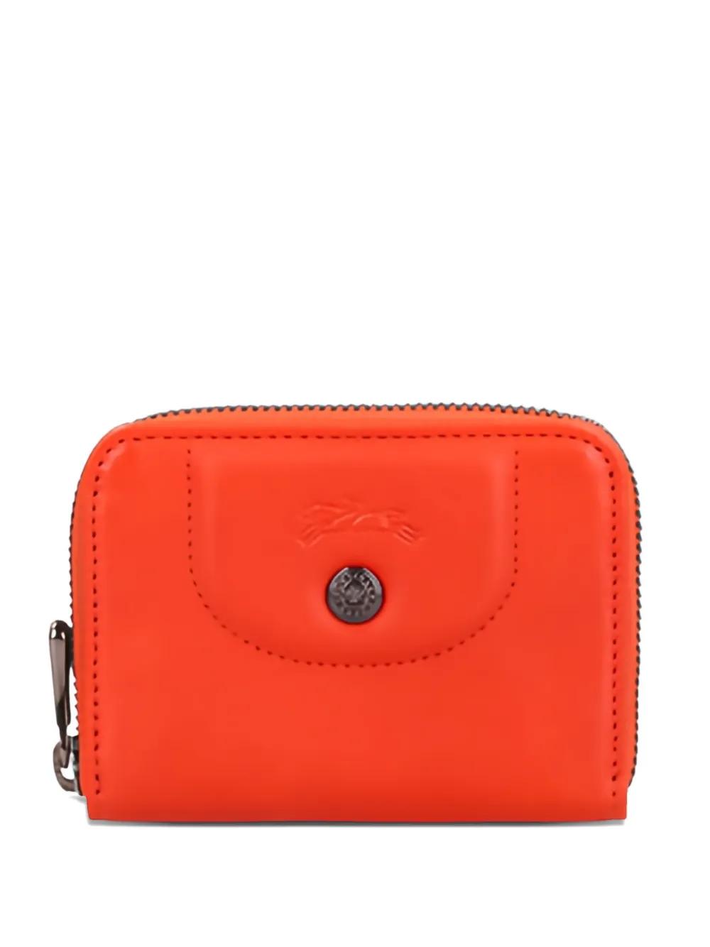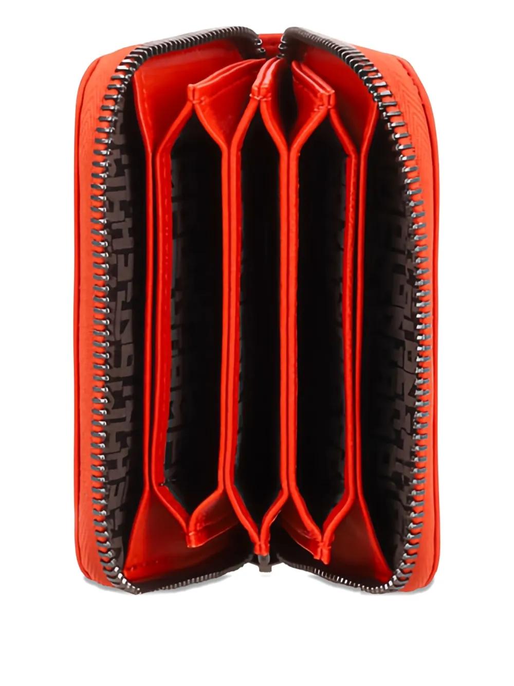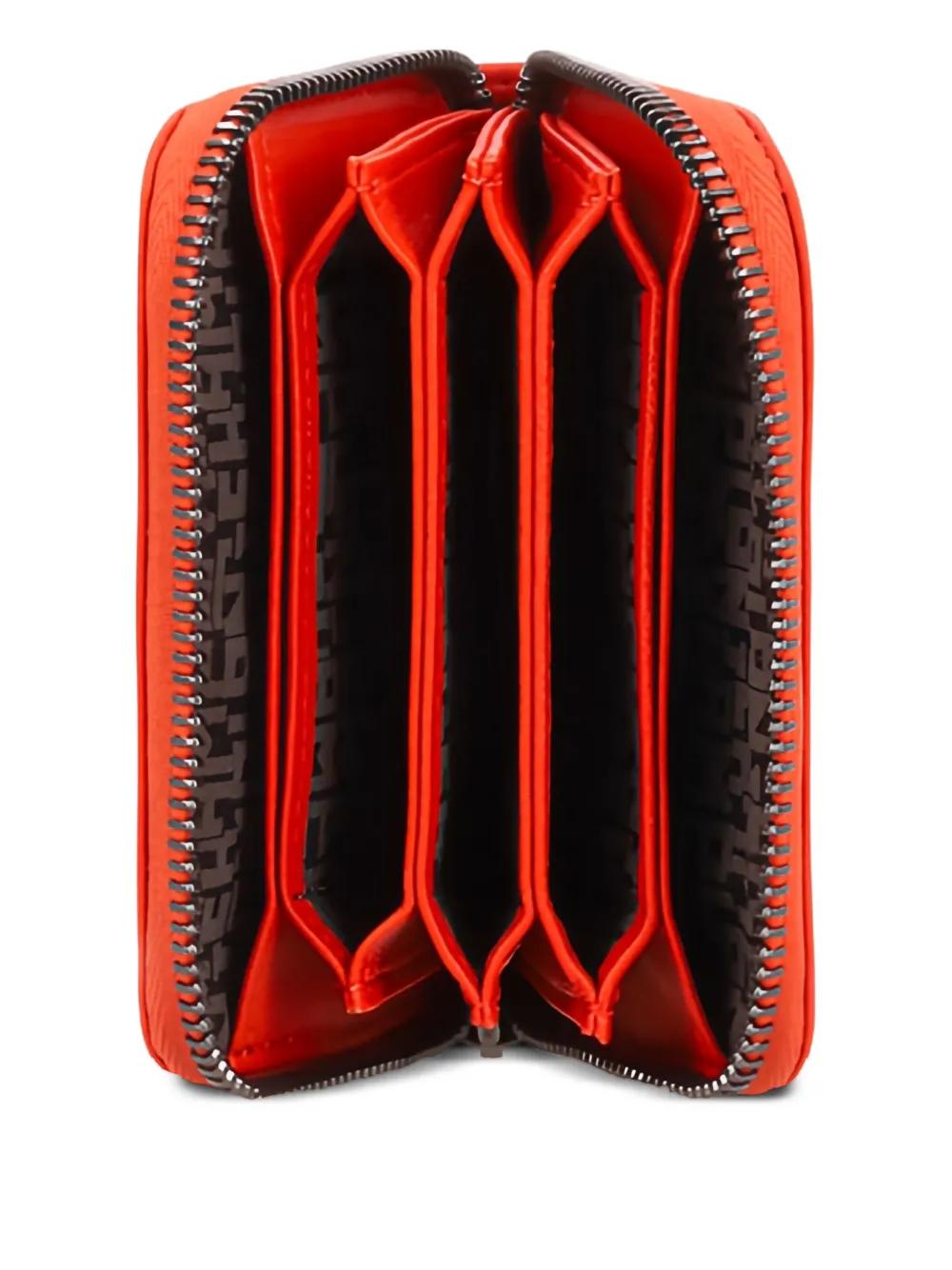 dark garnet red leather logo detail exterior zip pocket snap fastening multiple internal card slots