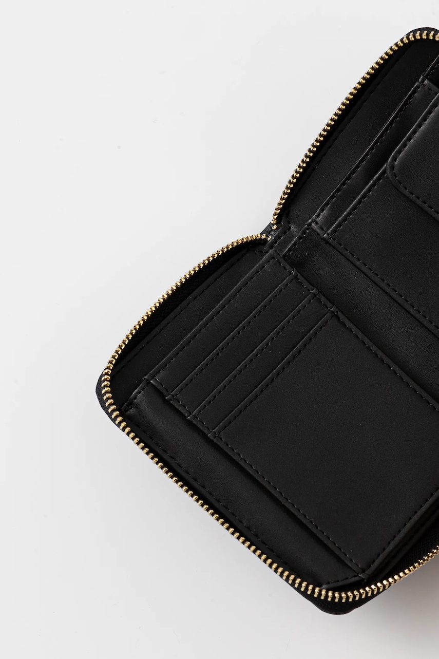 - Zapięcie na suwak. - Przegroda na banknoty. - Kieszeń na bilon zapinana na zatrzask. - Liczba przegródek na karty: 7. - Wymiary: 10 x 13 x 2 cm.