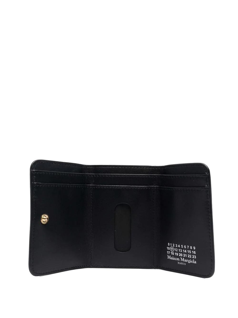 Black leather small leather wallet from Maison Margiela featuring signature four-stitch logo, foldover top, snap fastening and internal note compartments.