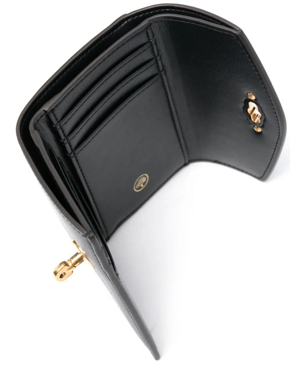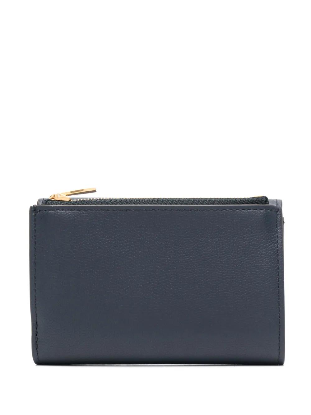 navy blue calf leather tri-fold design grained texture embossed internal logo internal logo stamp internal card slots internal note compartments rear zipped coin pocket signature Postman’s Lock closure