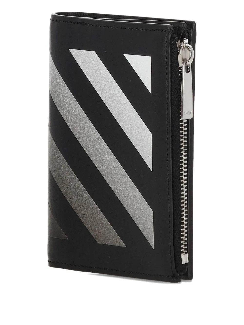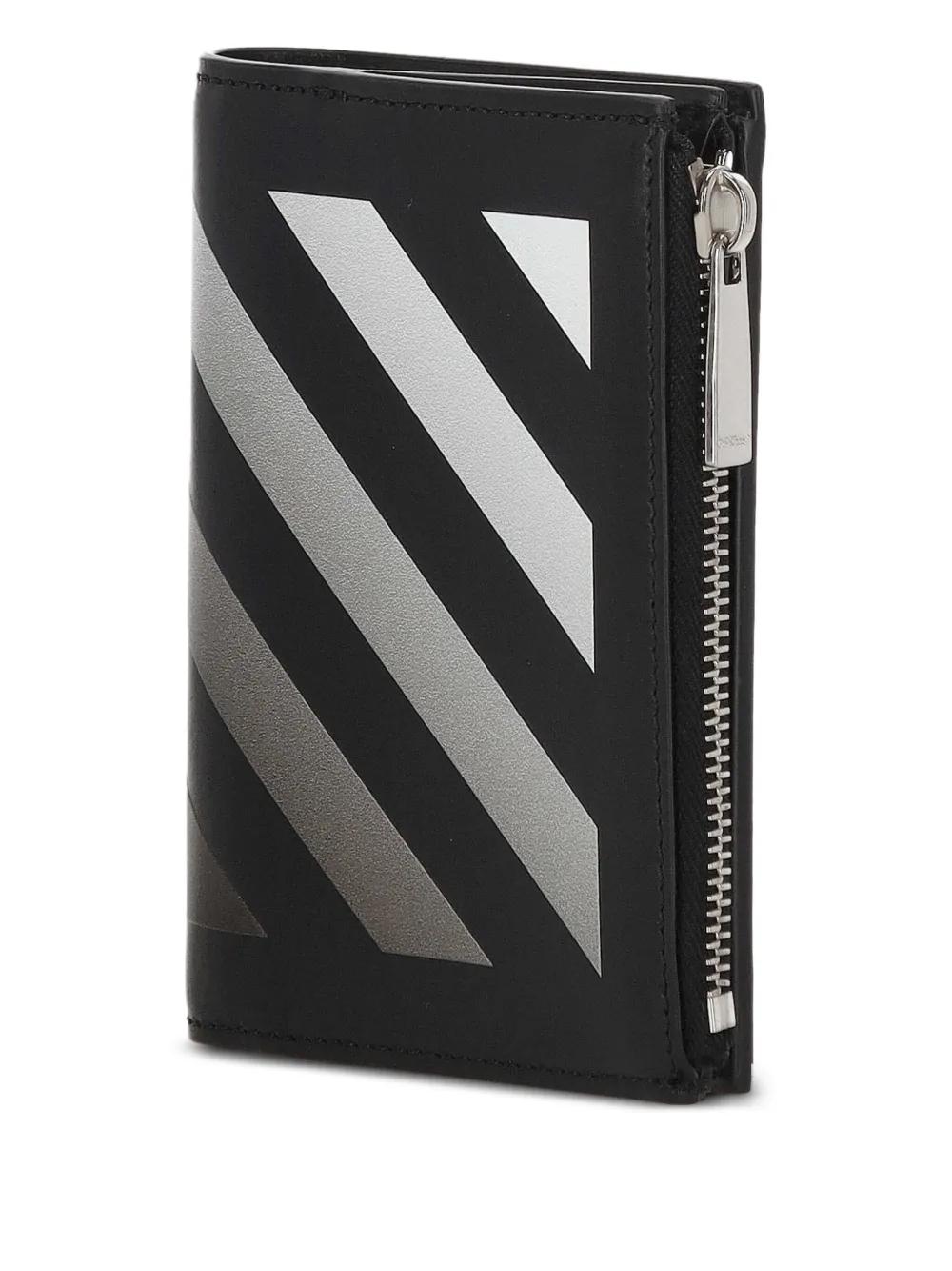 black diagonal stripes zip detail press-stud fastening internal card slots snap button compartments
