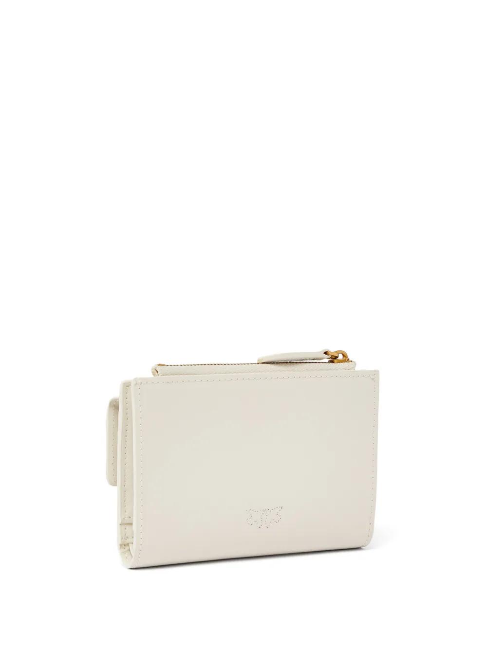 white leather smoothing finish bi-fold design press-stud fastening signature Love Birds plaque multiple internal slip pockets internal card slots transparent ID slot tag coin pocket debossed internal logo leather lining gold-tone hardware