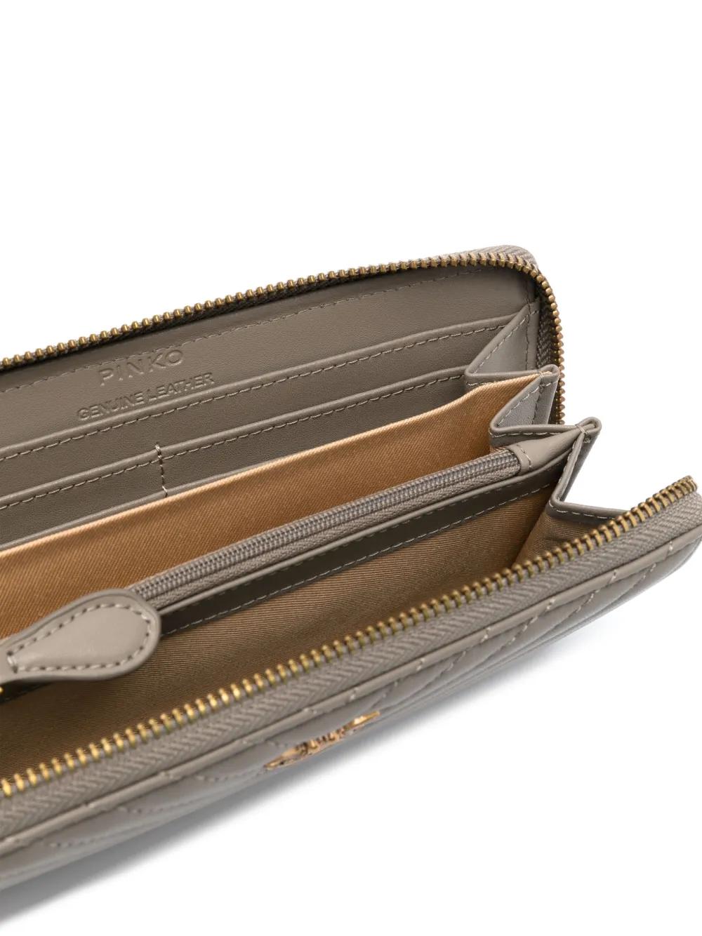 sesame beige calf leather smooth grain padded design chevron quilting signature Love Birds buckle embroidered logo to the rear partitioned compartment debossed internal logo two internal note compartments eight internal card slots internal zip-fastening pocket full lining gold-tone hardware all-around zip fastening