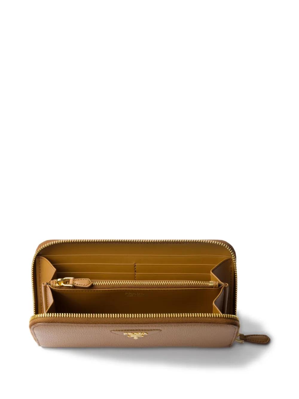 caramel brown zip closure triangular logo plaque multiple card slots interior compartments gold-tone hardware