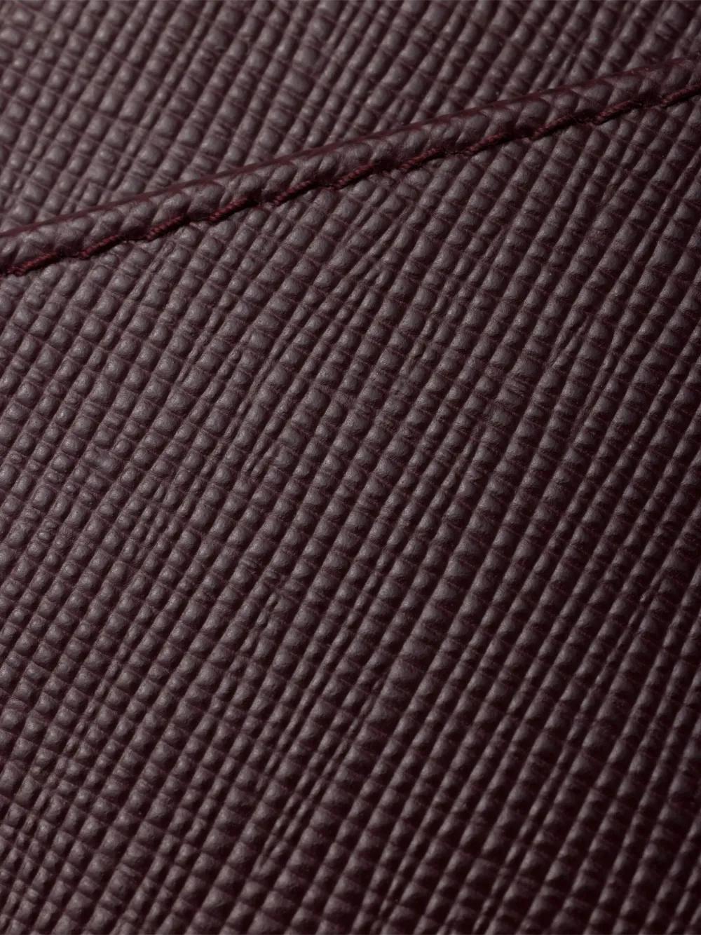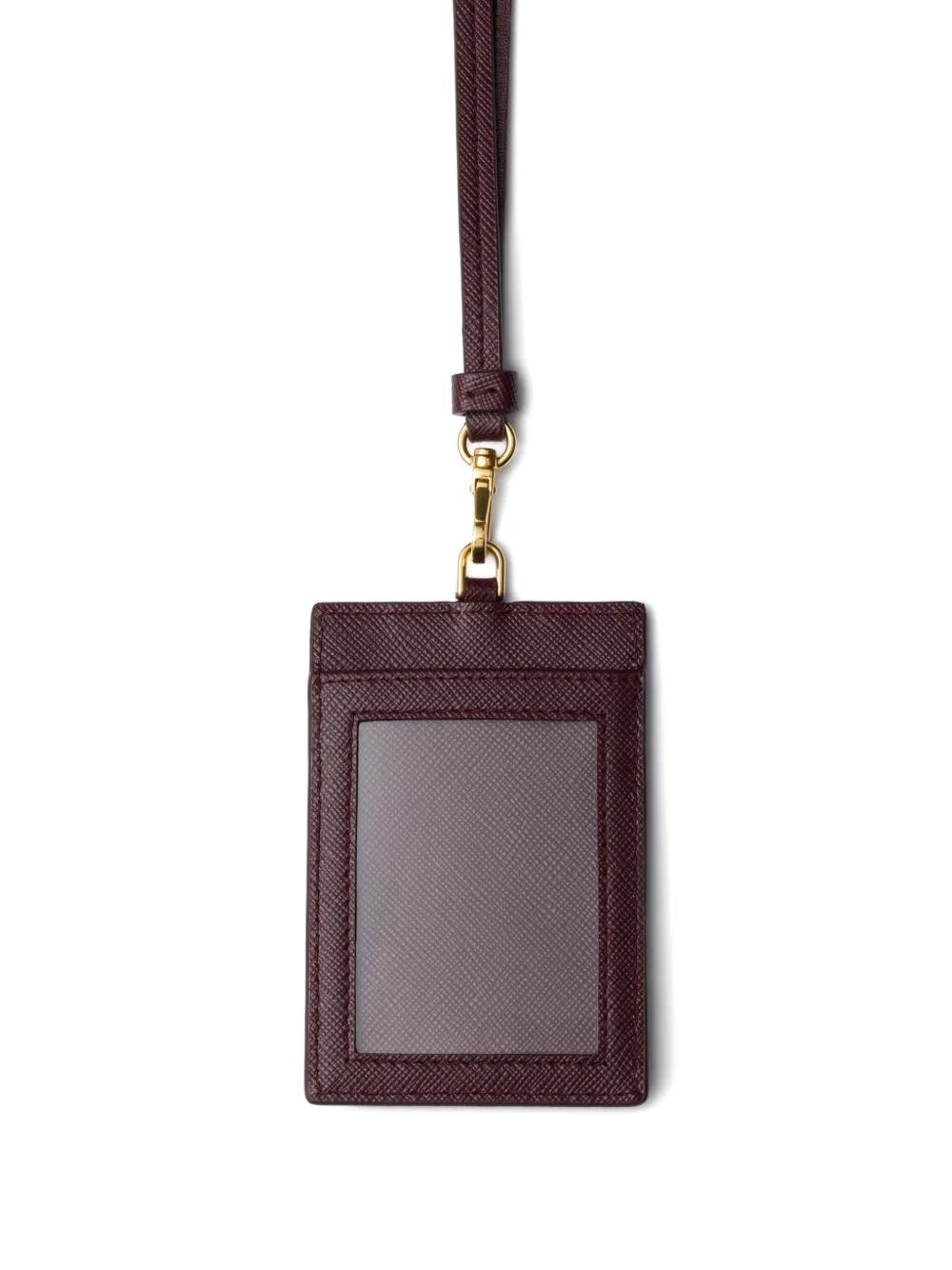 burgundy Saffiano leather detachable neck strap two card slots enamel triangle logo gold-tone hardware