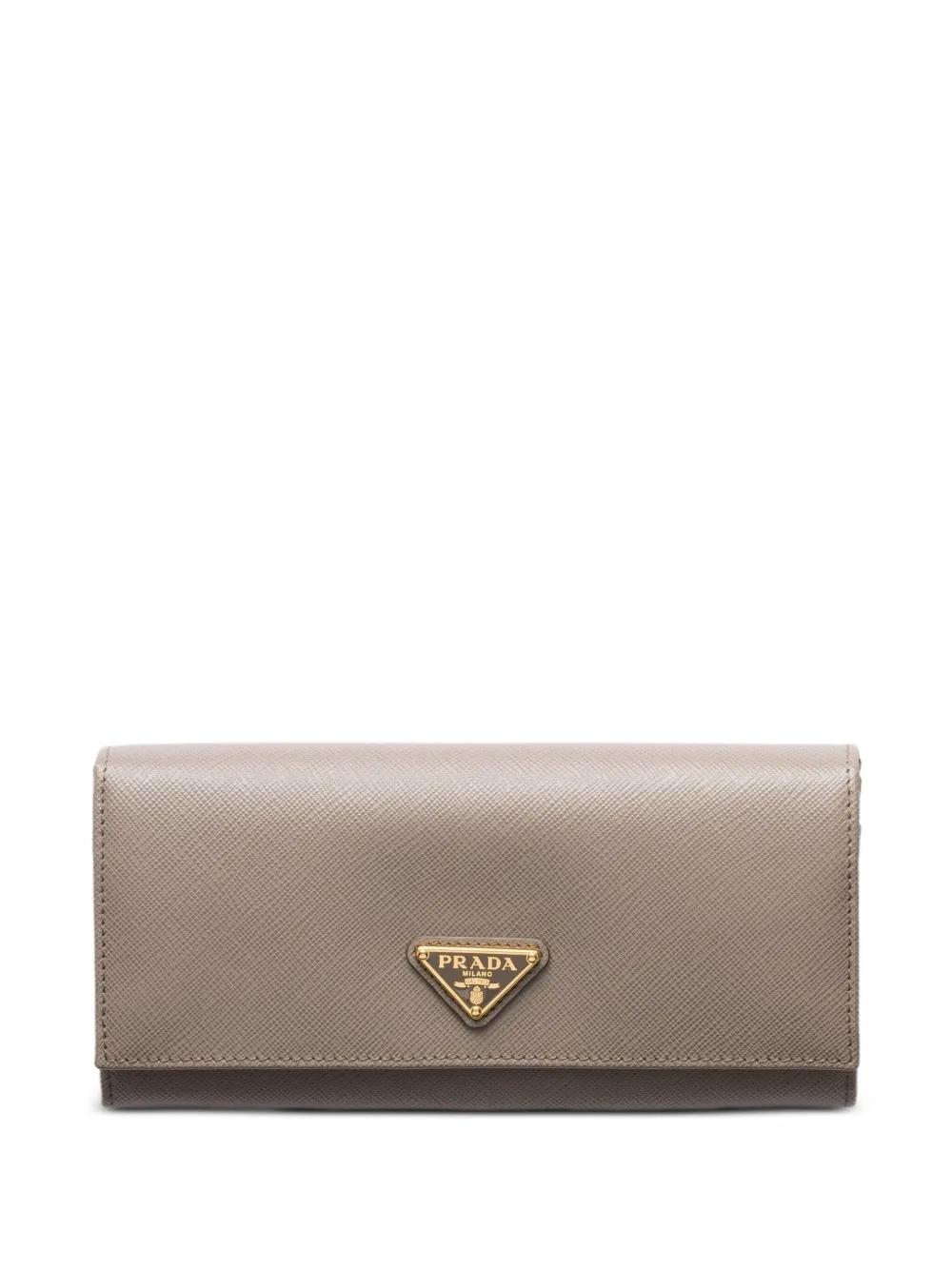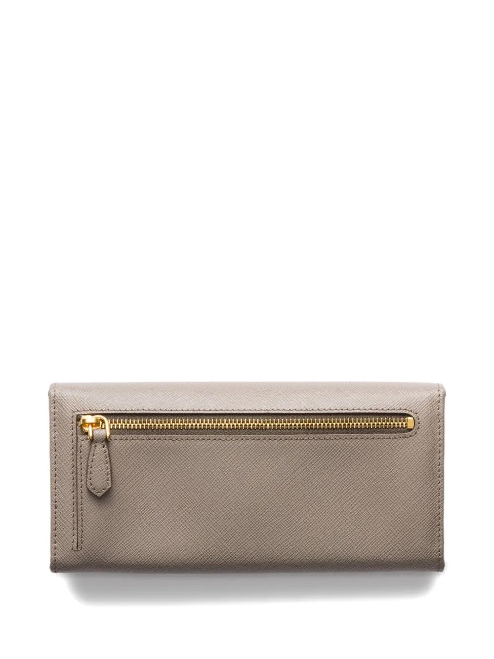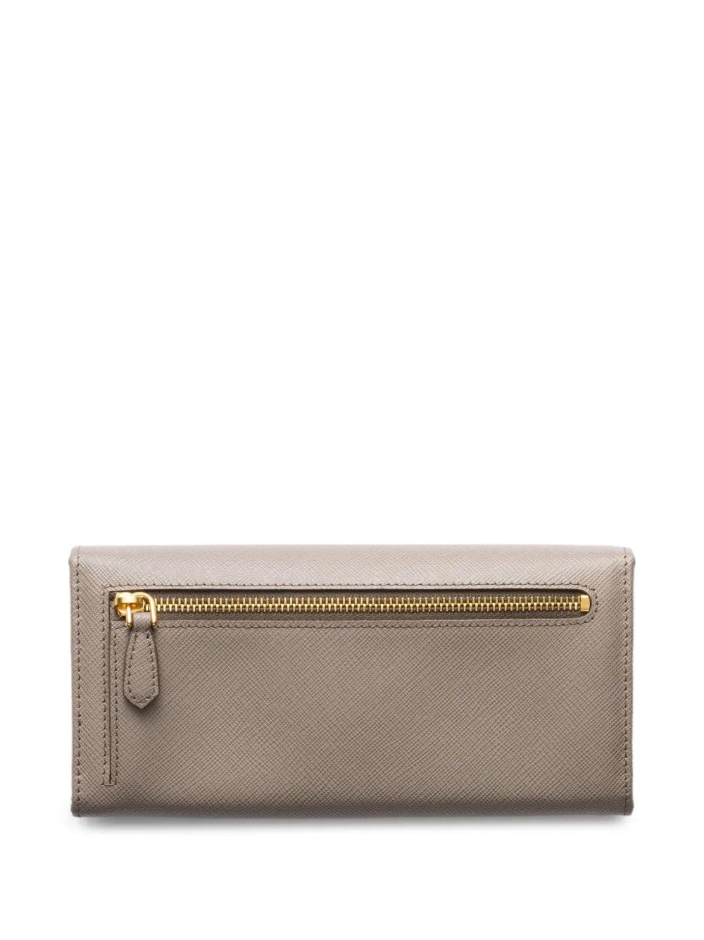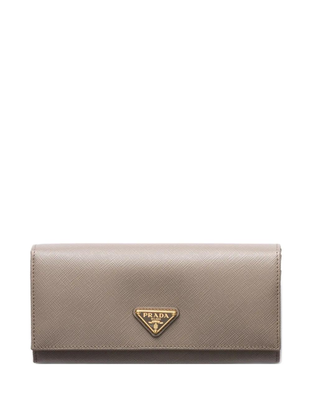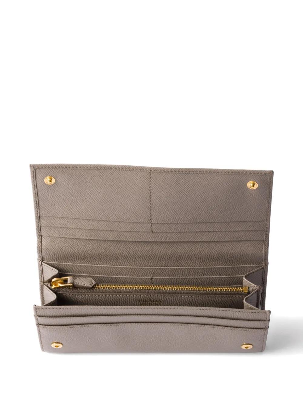 grey enameled metal triangle logo snap closure two bill compartments ten card slots internal coin pocket zipper external coin pocket zipper