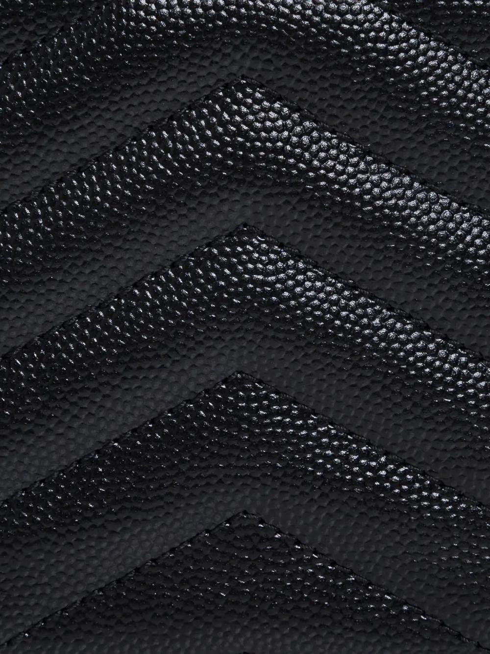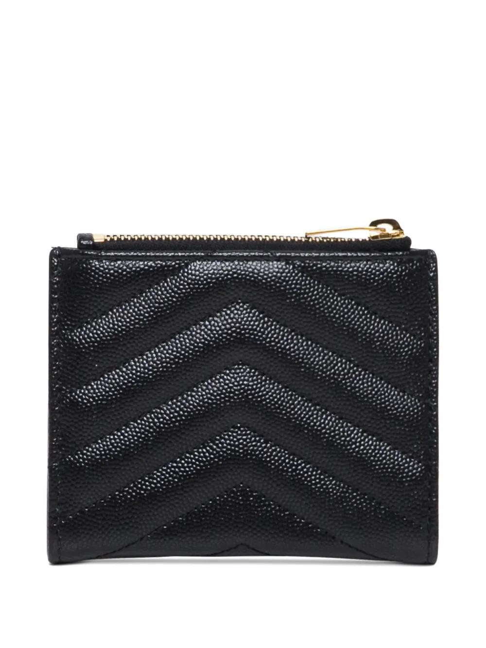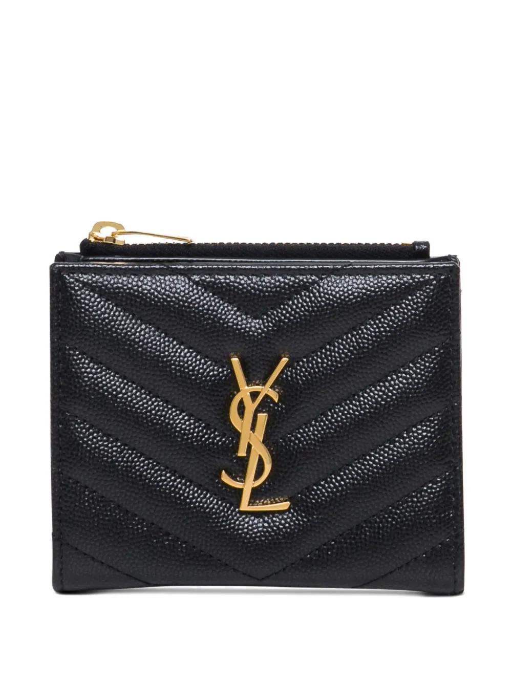 black grained finish gold-tone logo snap button closure top zip pocket credit card slots