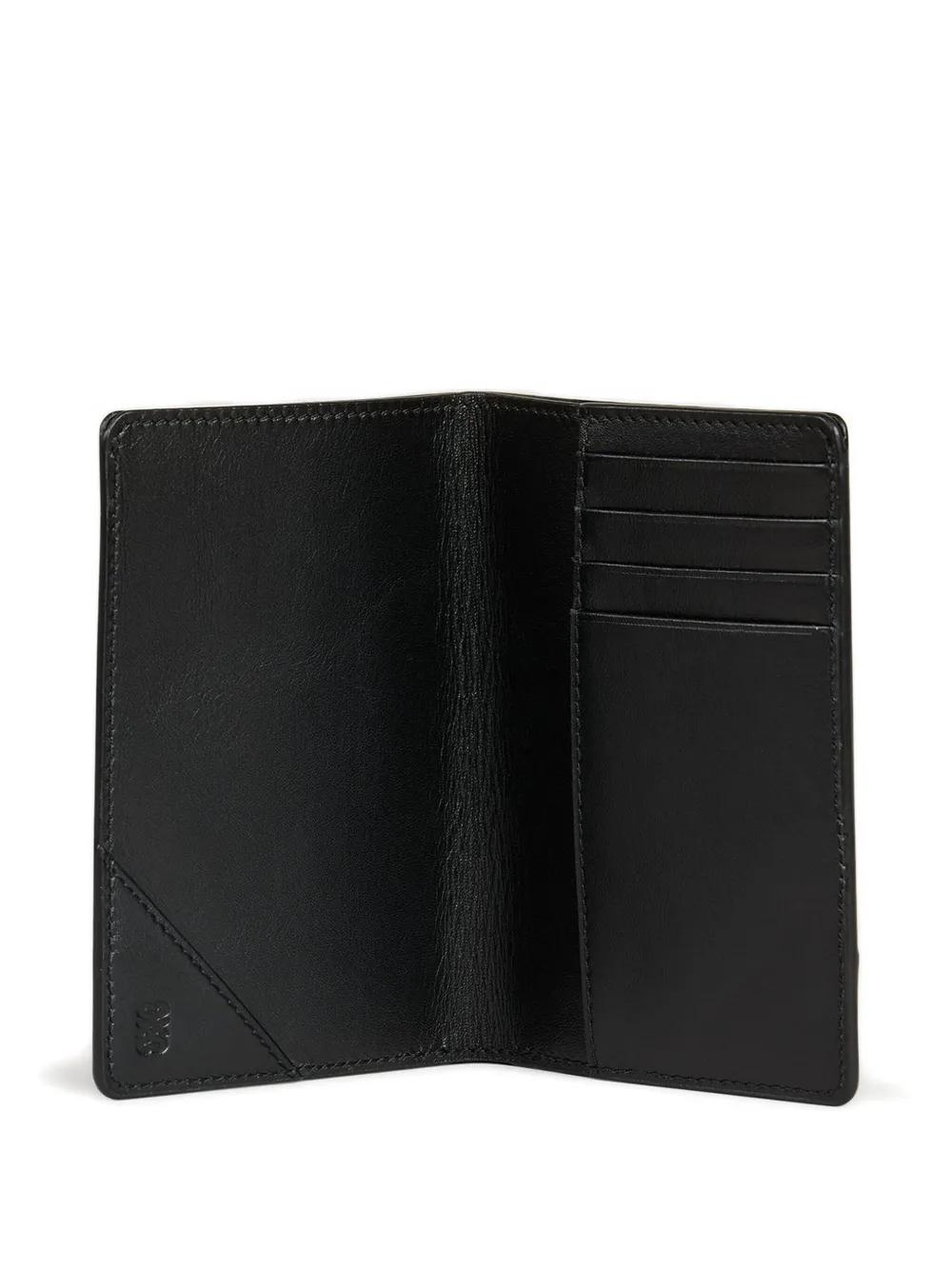 black smooth grain finish diagonal stripe motif debossed logo multiple card slots leather