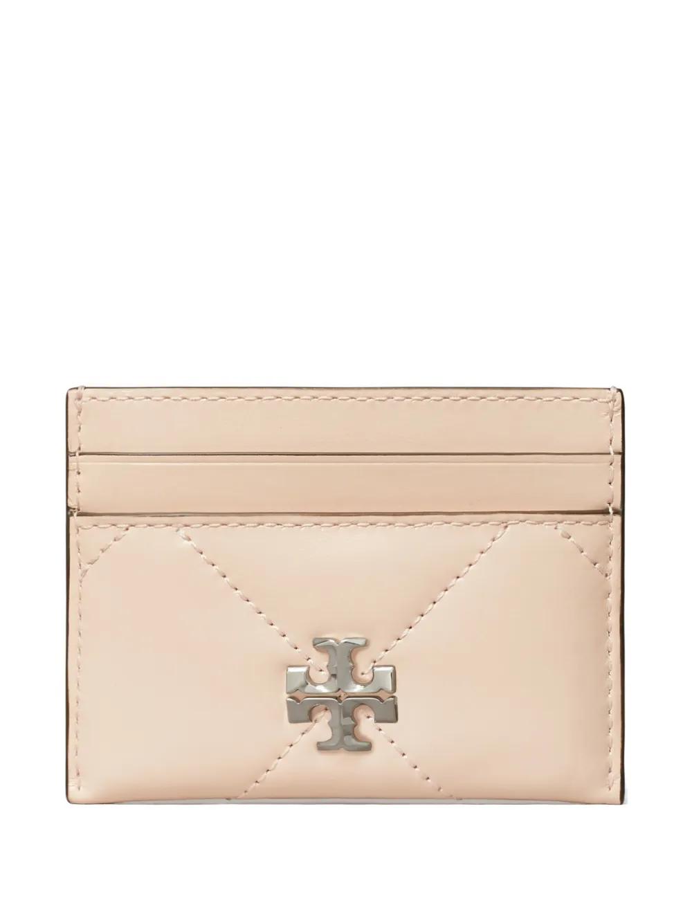 blush pink silver-tone logo plaque four card slots diagonal stitch detailing slim profile