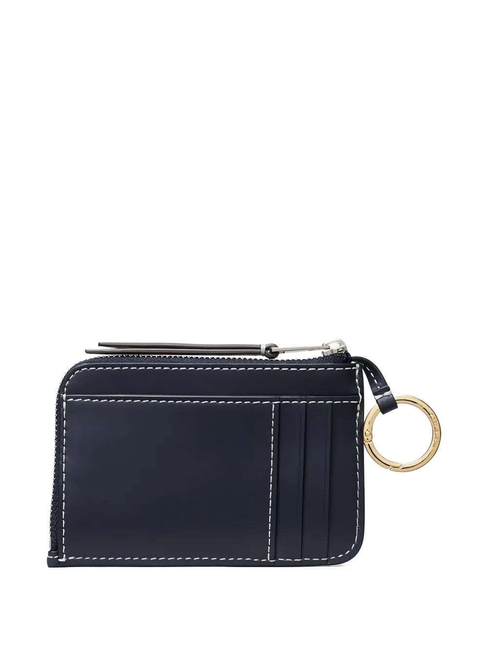 navy blue top zip fastening front flap pocket rear card slots contrast stitching