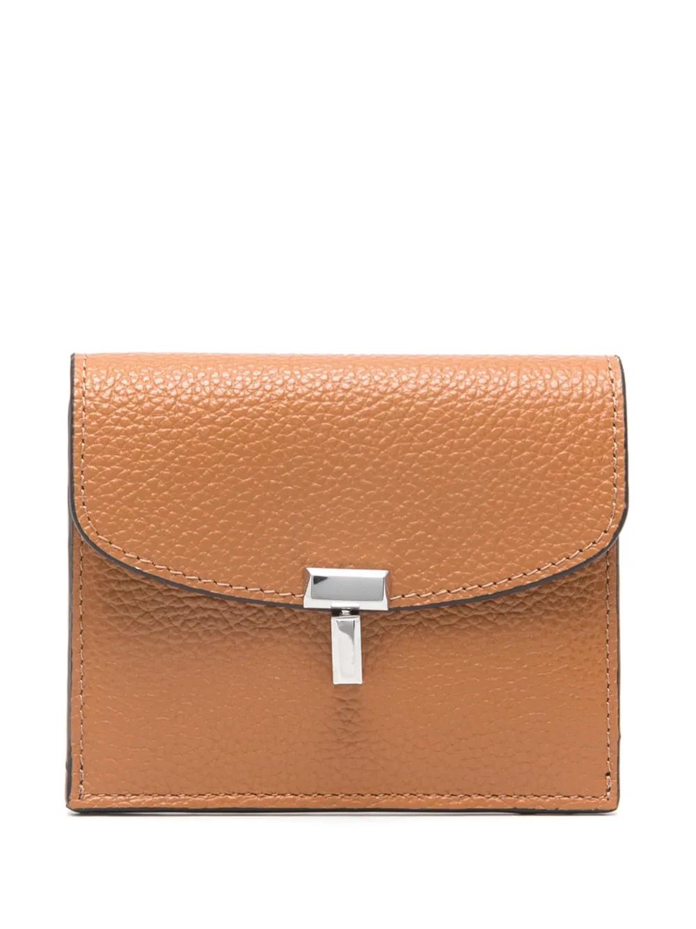light brown grained leather T-lock closure card slots compact design minimal aesthetic