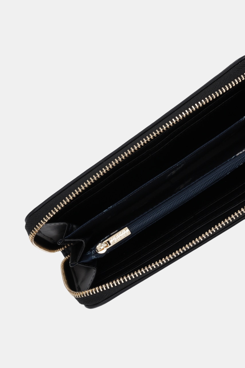 - Zapięcie na suwak. - Kieszeń na bilon zapinana na zamek. - Dwie przegrody na banknoty. - Liczba przegródek na karty: 8. - Model zapakowany w pudełko firmowe. - Wymiary: 10,5 x 19 cm.