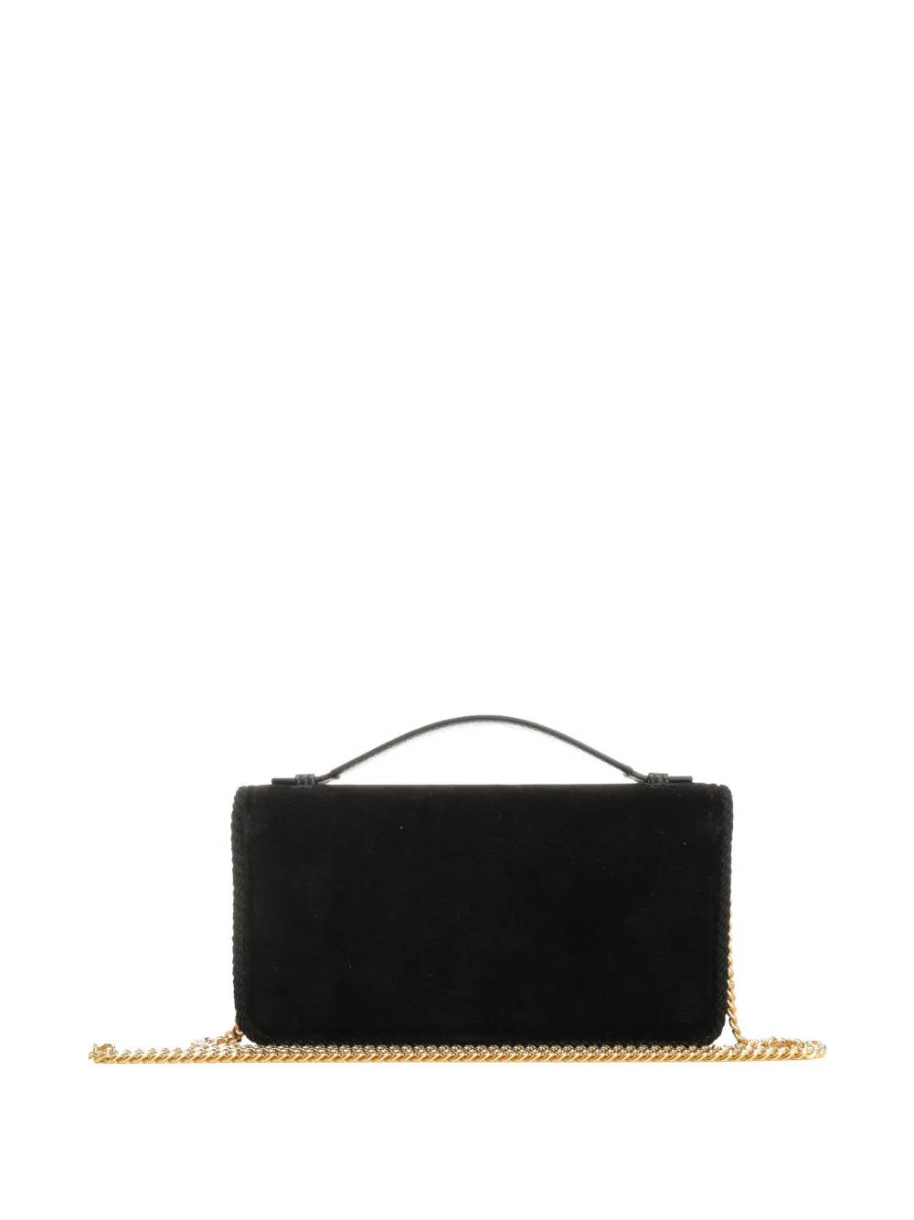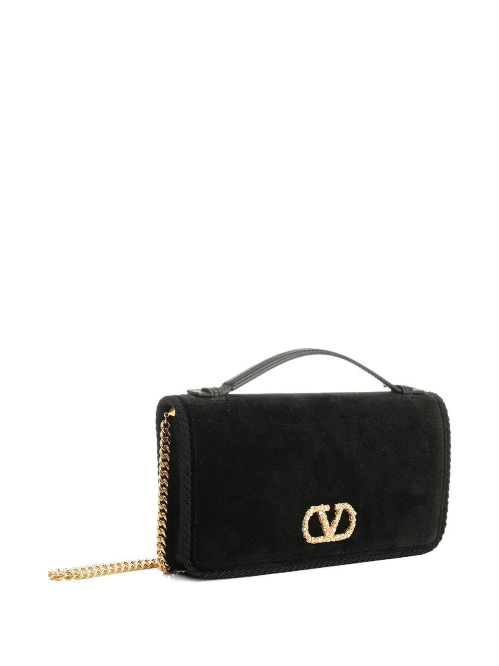 black velvet finish VLogo Signature plaque synthetic pearl embellishment Swarovski crystal embellishment leather top handle foldover top with magnetic fastening detachable chain strap braided trim internal compartment