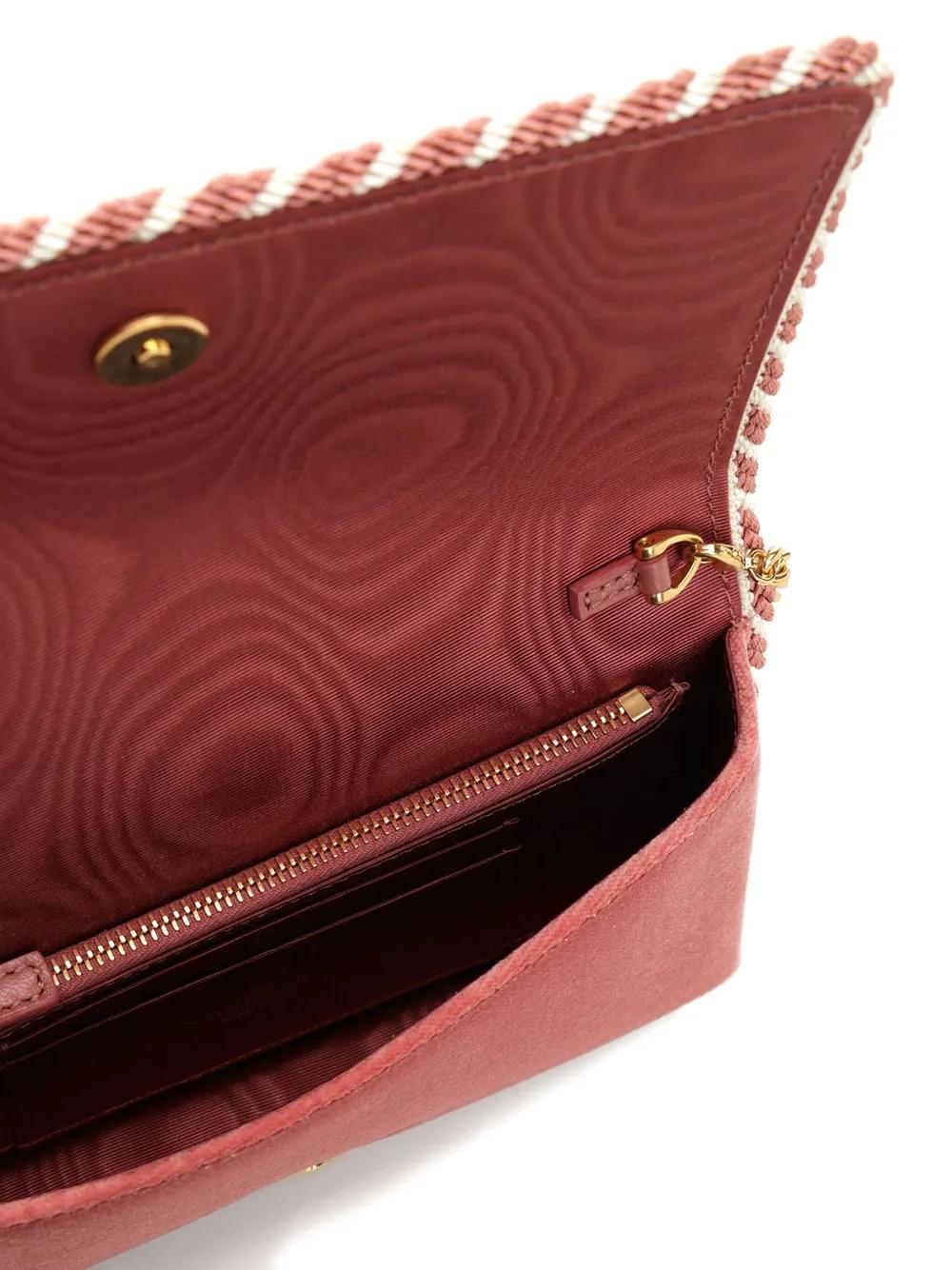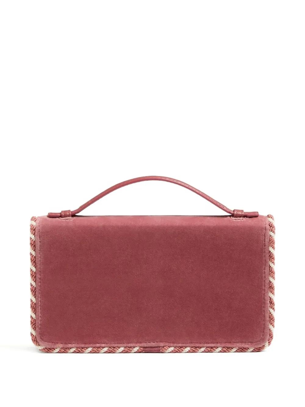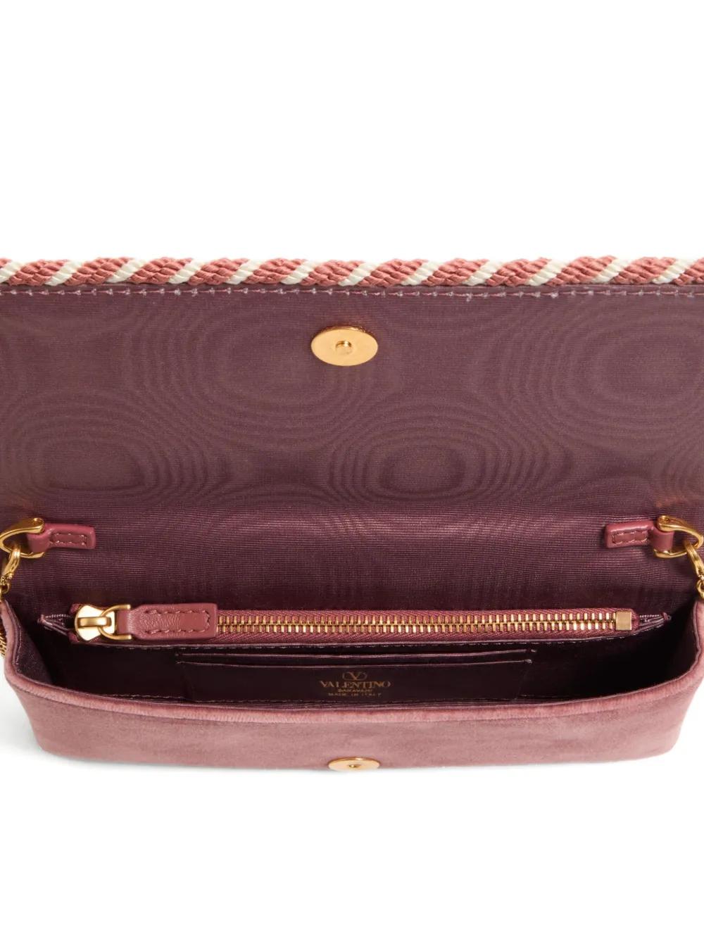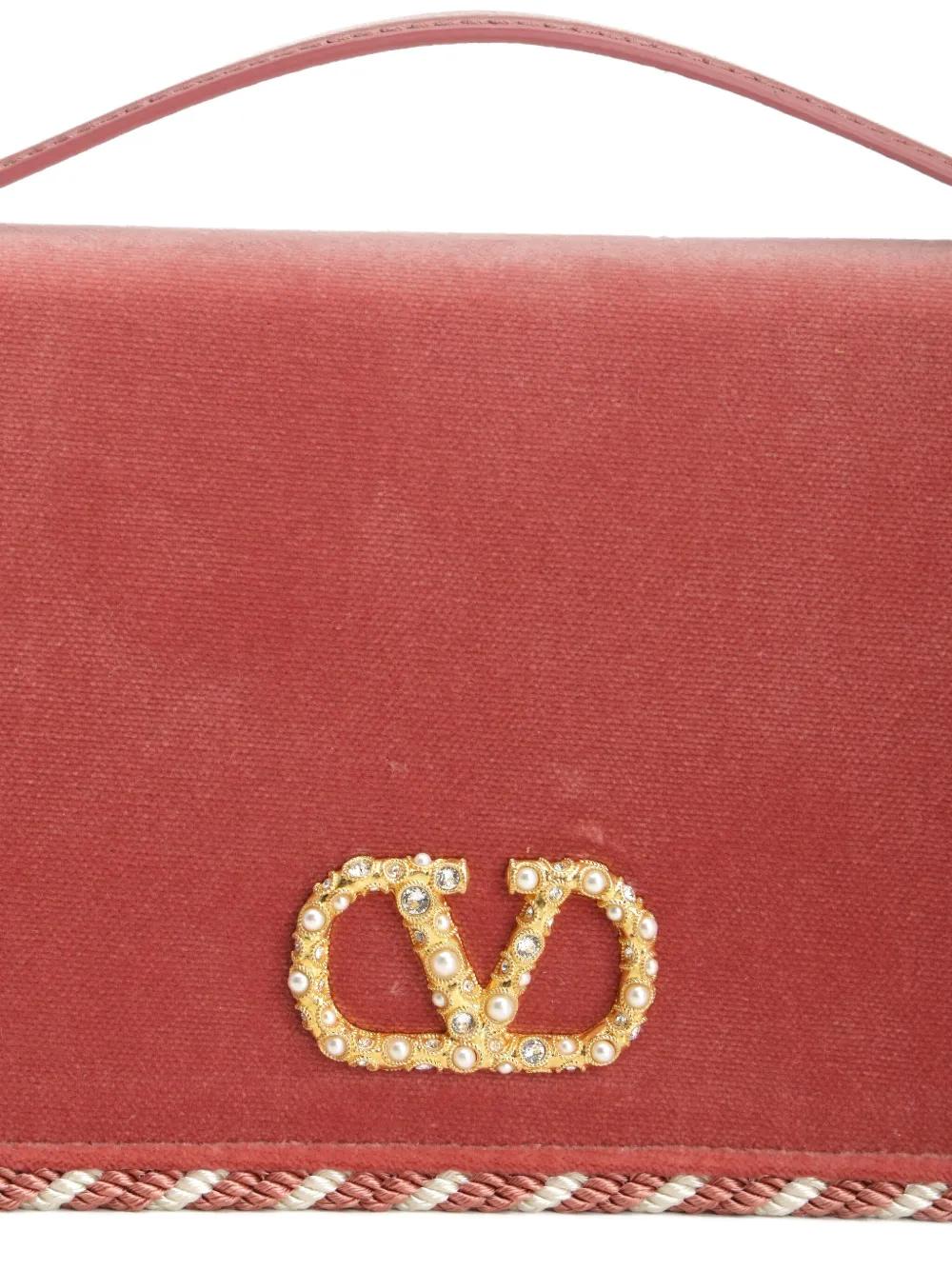 pink velvet finish VLogo Signature plaque synthetic pearl embellishment Swarovski crystal embellishment leather top handle foldover top with magnetic fastening detachable chain strap braided trim internal compartment