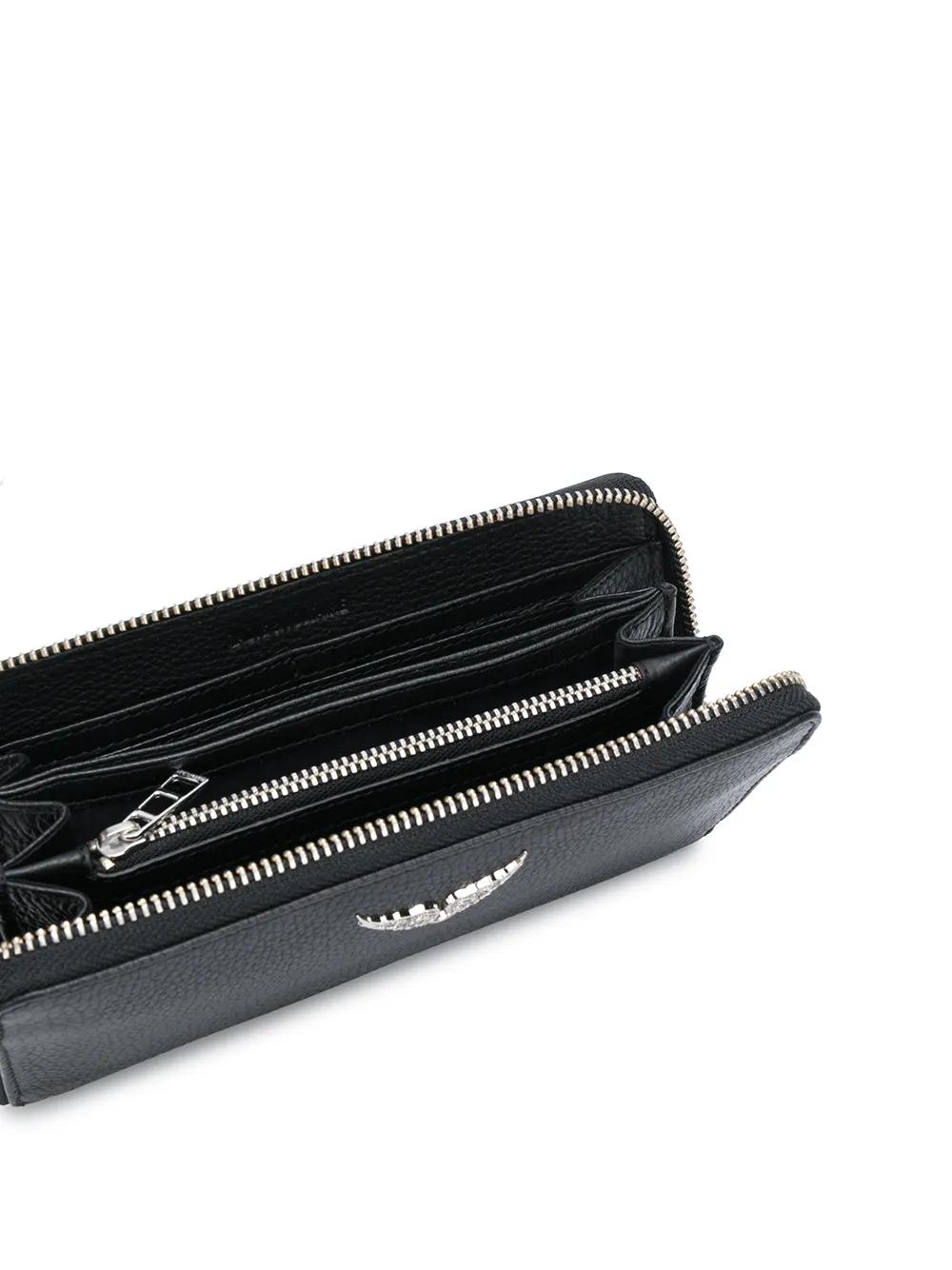 black leather silver-tone logo plaque wrist strap note compartment internal zip pocket card slots all-around zip fastening
