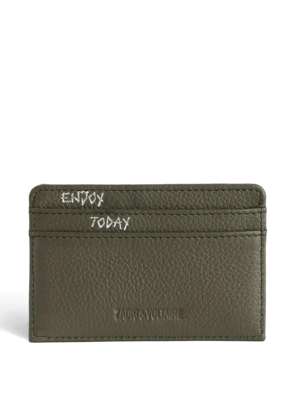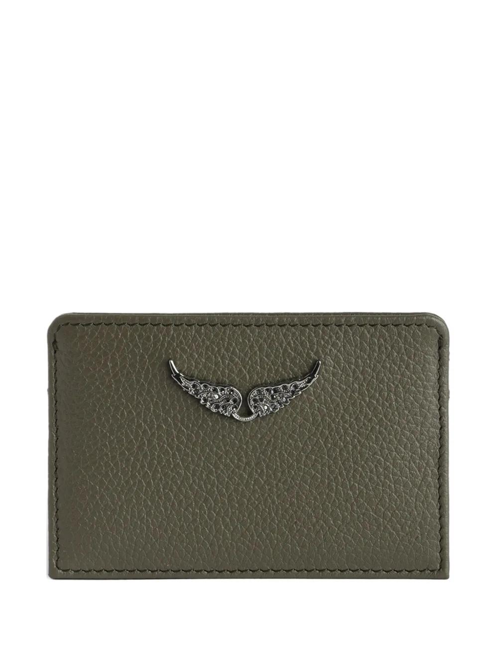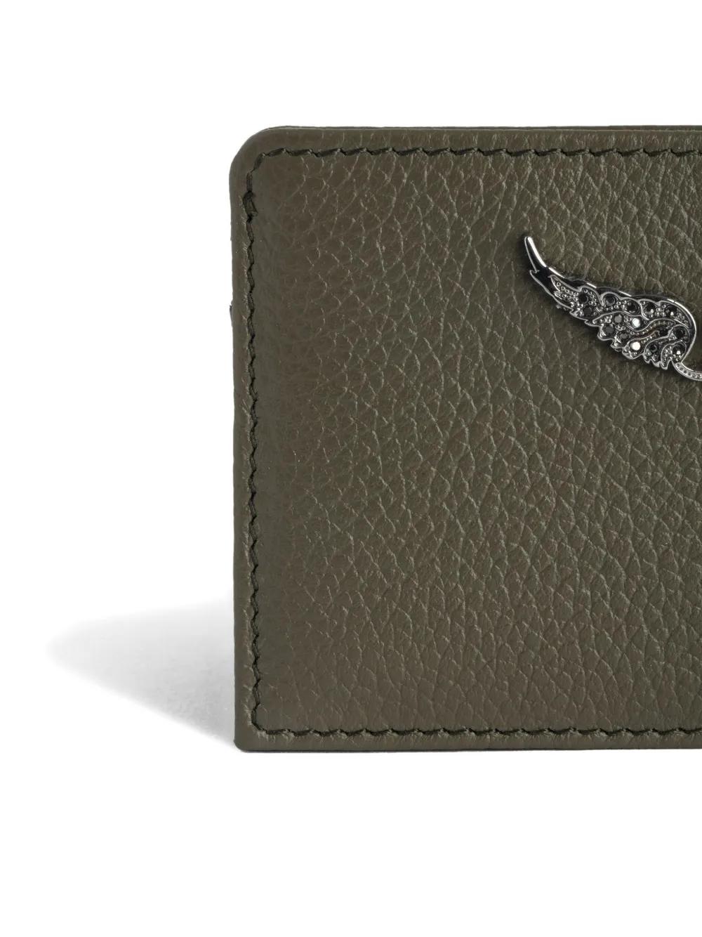 olive green leather wing emblem stitched edges debossed lettering multiple card slots