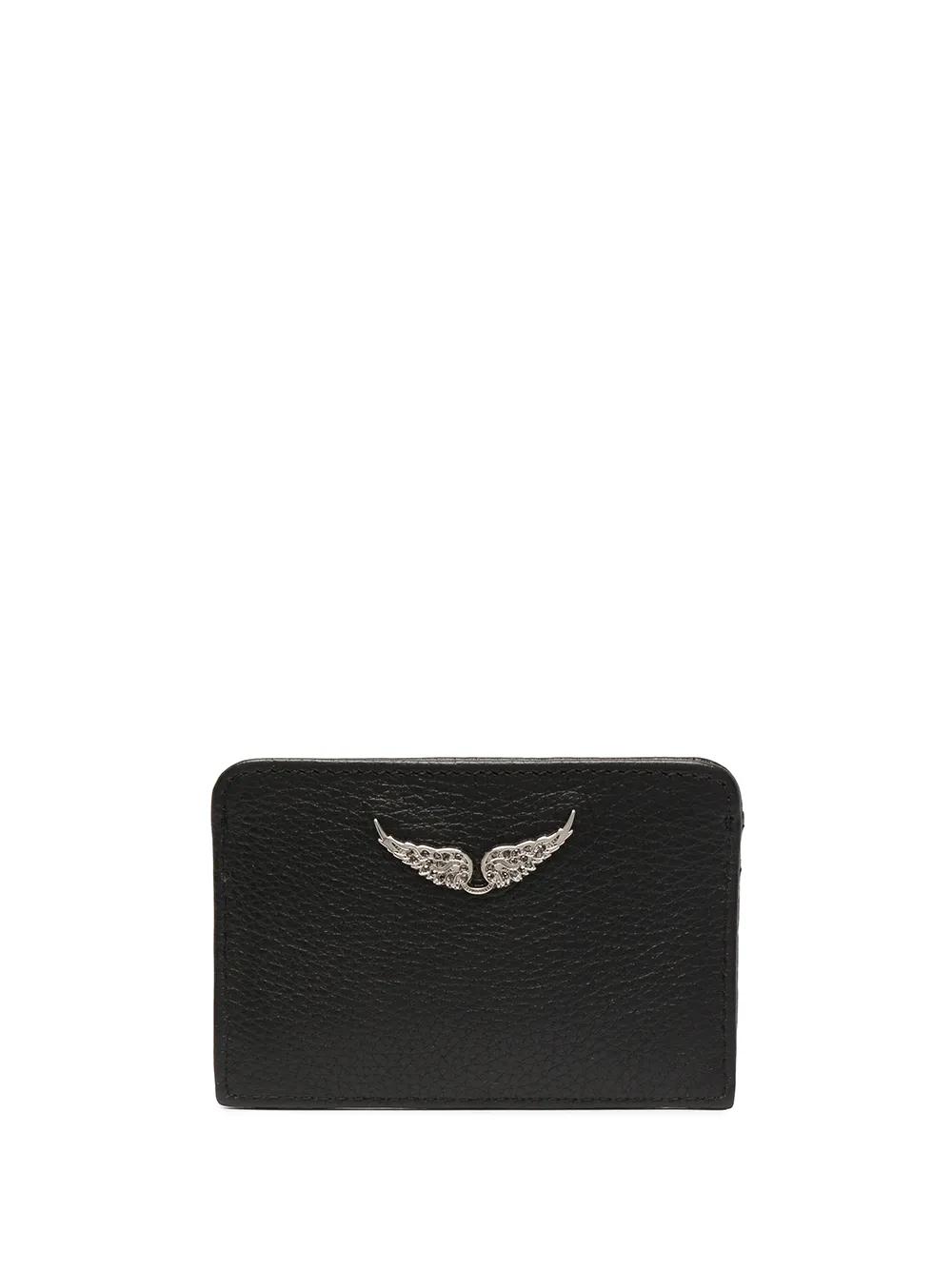 black leather pebbled texture silver-tone logo plaque main compartment slip-on style card slots