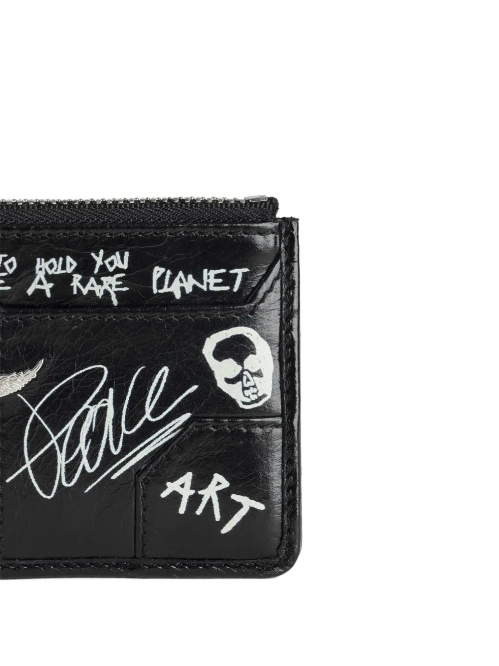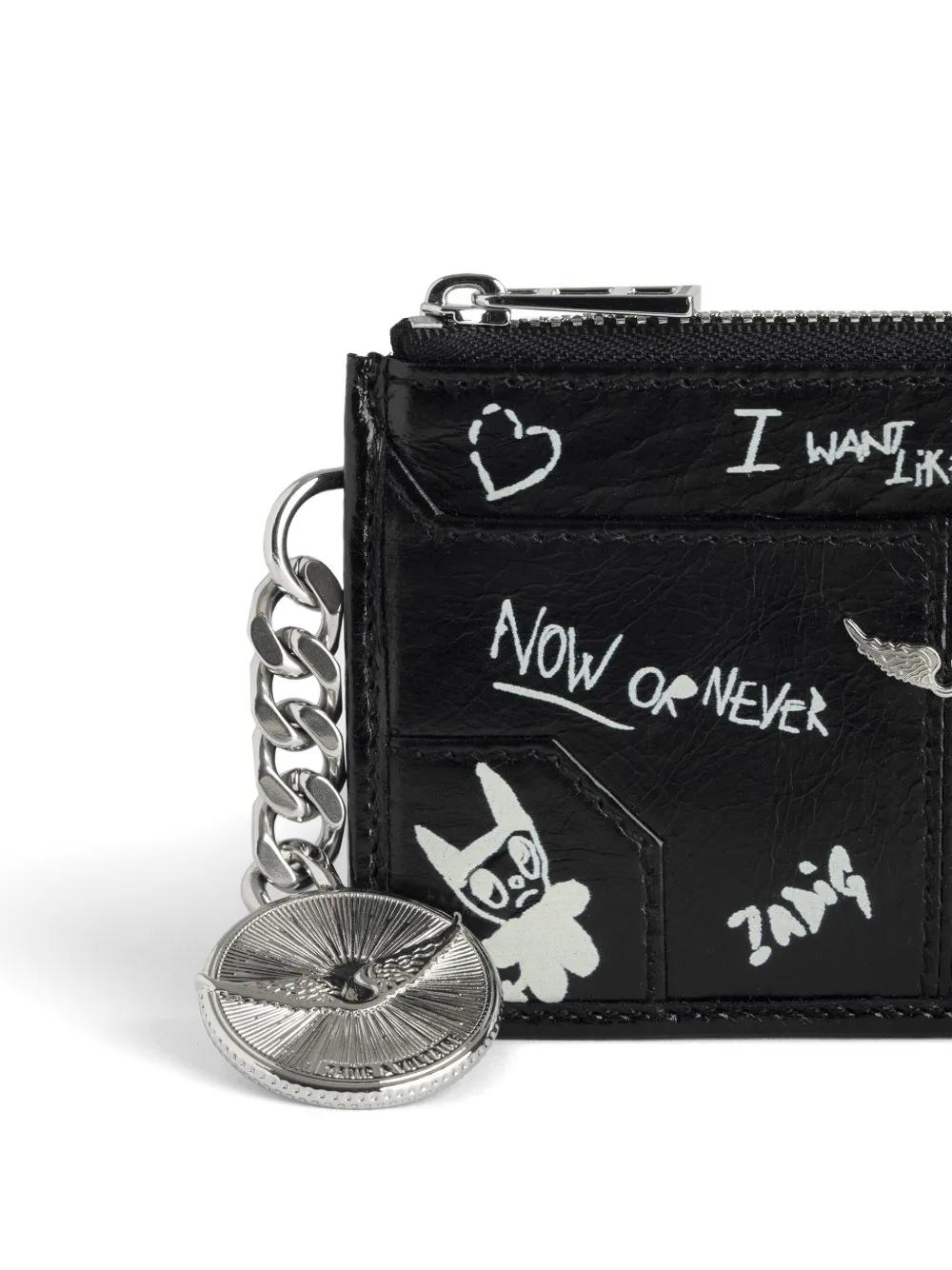 black calf leather patent finish illustration-style print zip-fastening compartment wings-logo charm medallion pendant chain-link trim slip pocket to the front and rear four rear card slots