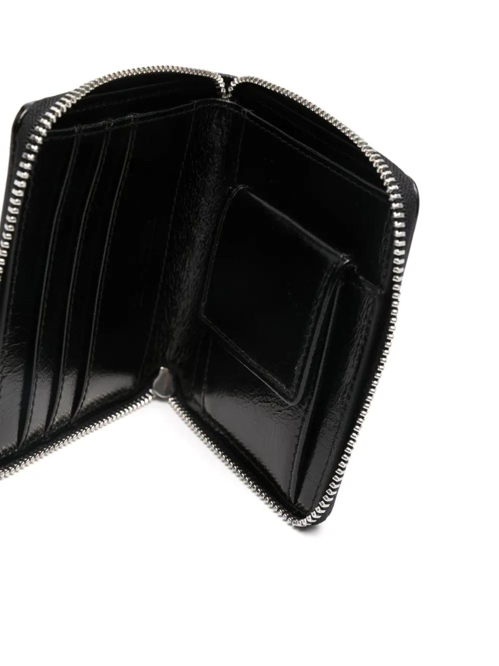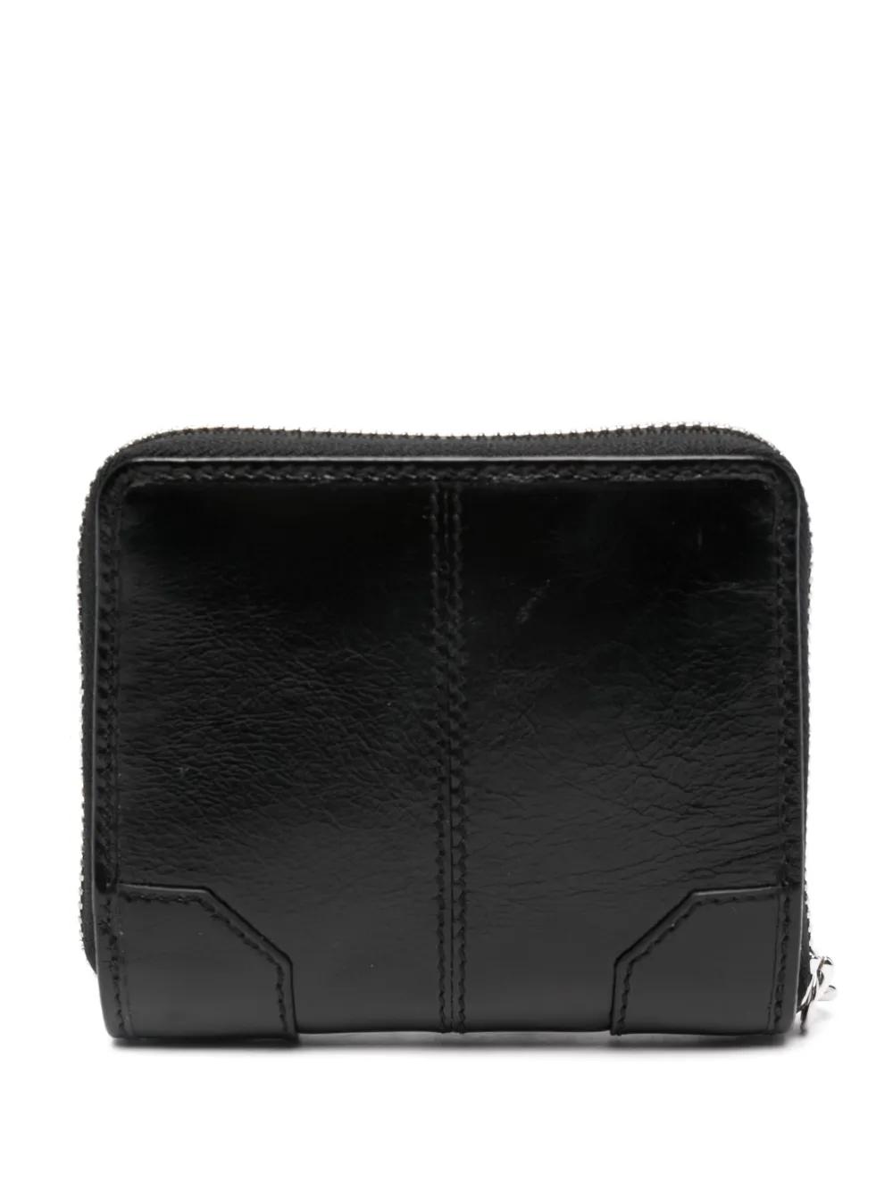 black calf leather crinkled finish panelled design logo pendant logo plaque single card slot to the front internal card slots internal note compartments internal coin pocket debossed internal logo silver-tone hardware all-around zip fastening