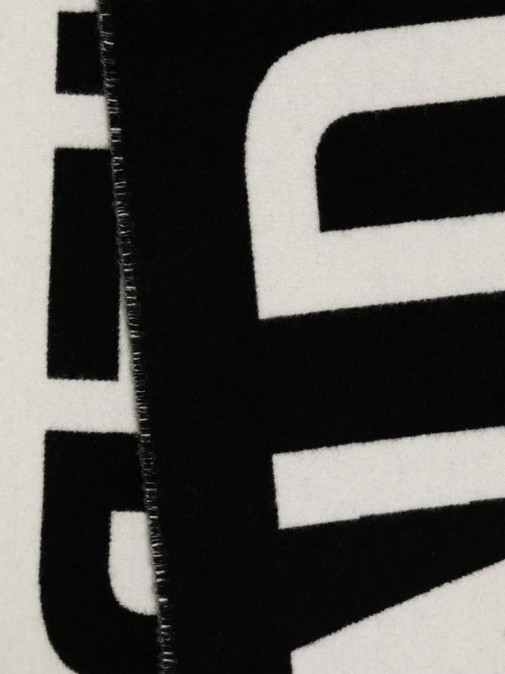 white/black virgin wool all-over logo print logo tag rectangle shape fringed edge wraparound style