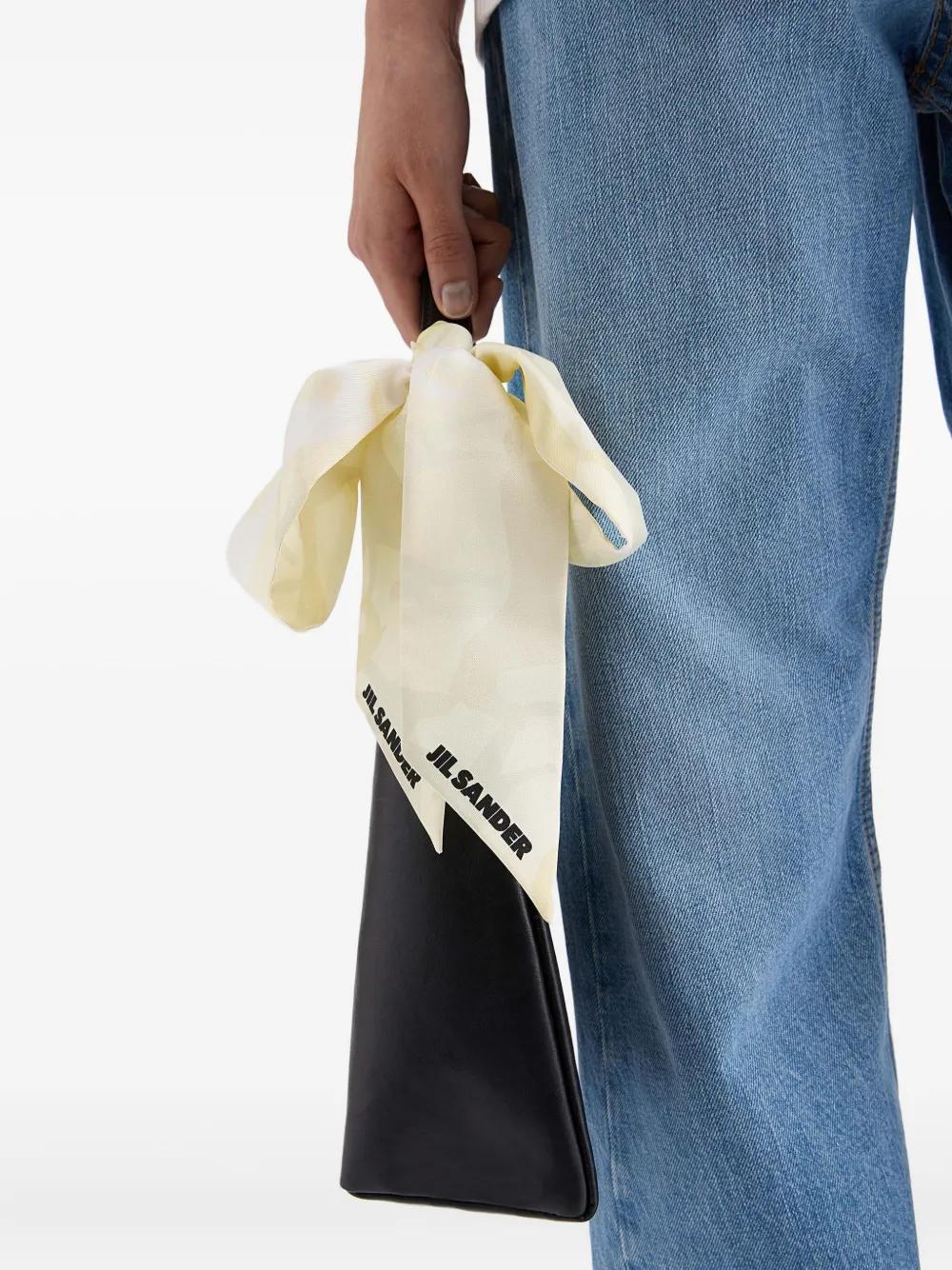 light brown virgin wool fine knit logo print to the front fringed edge rectangle shape wraparound style