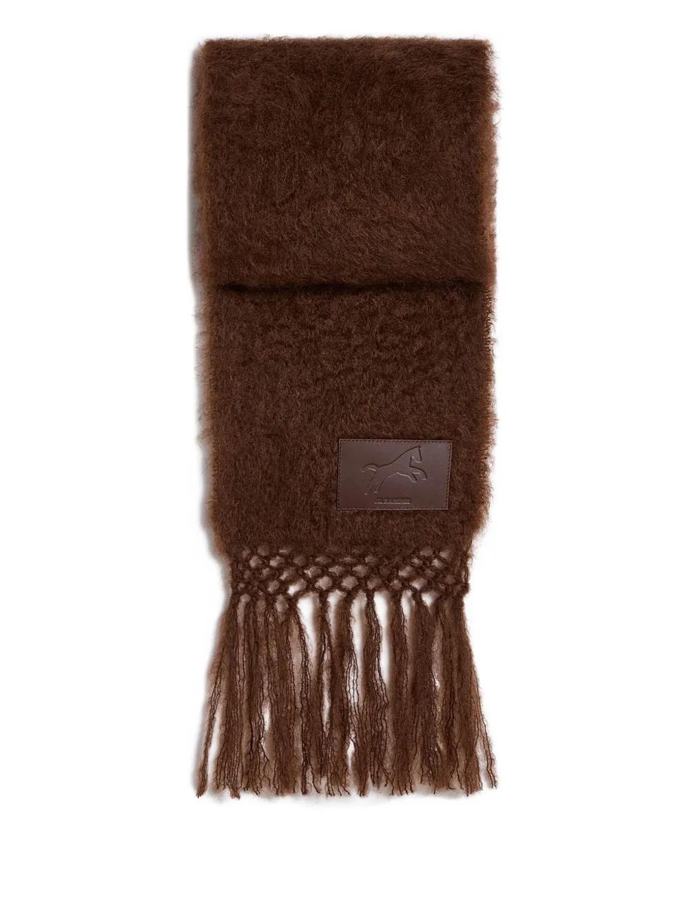 brown wool blend debossed horse symbol logo detail fringed hem