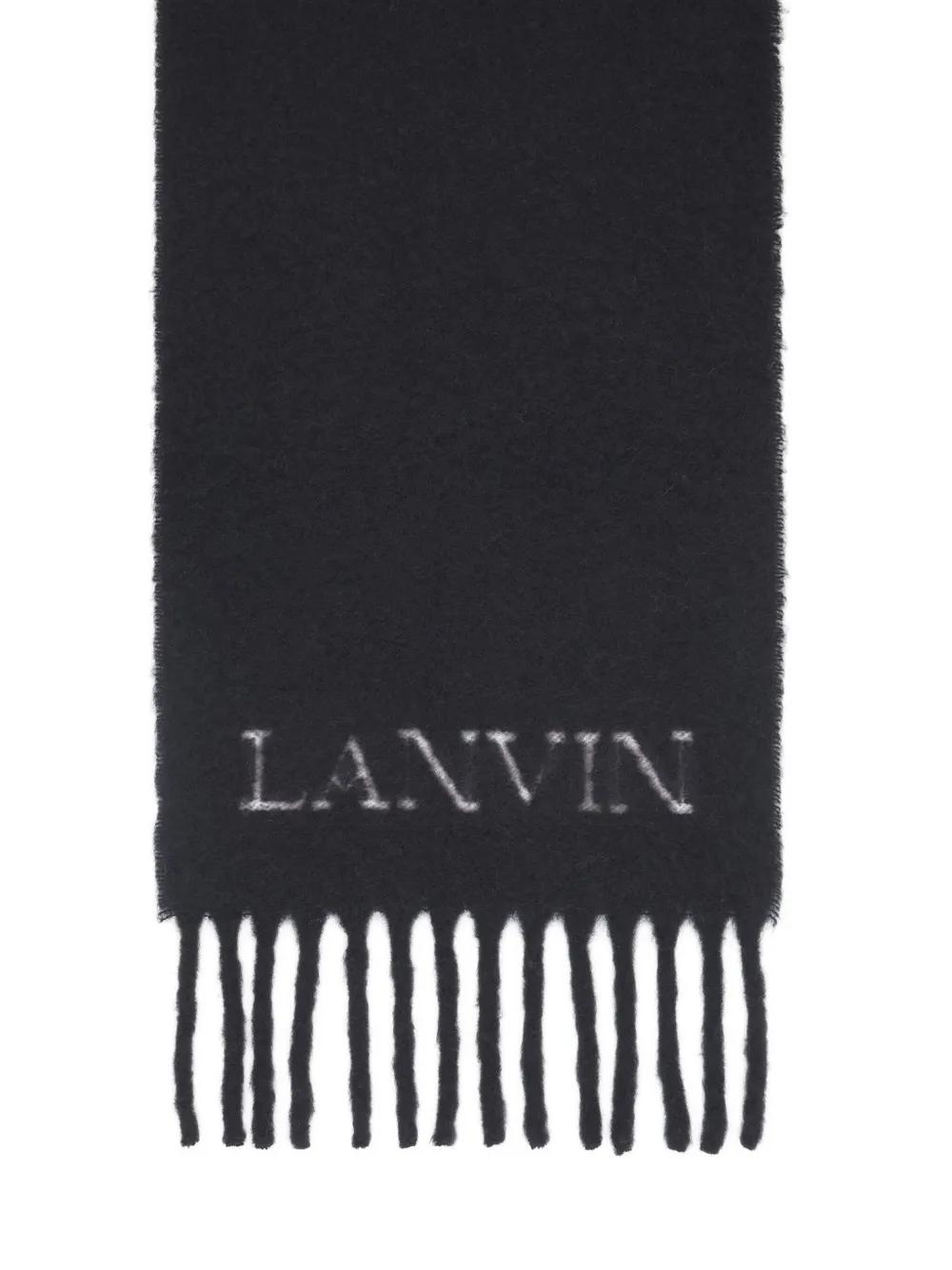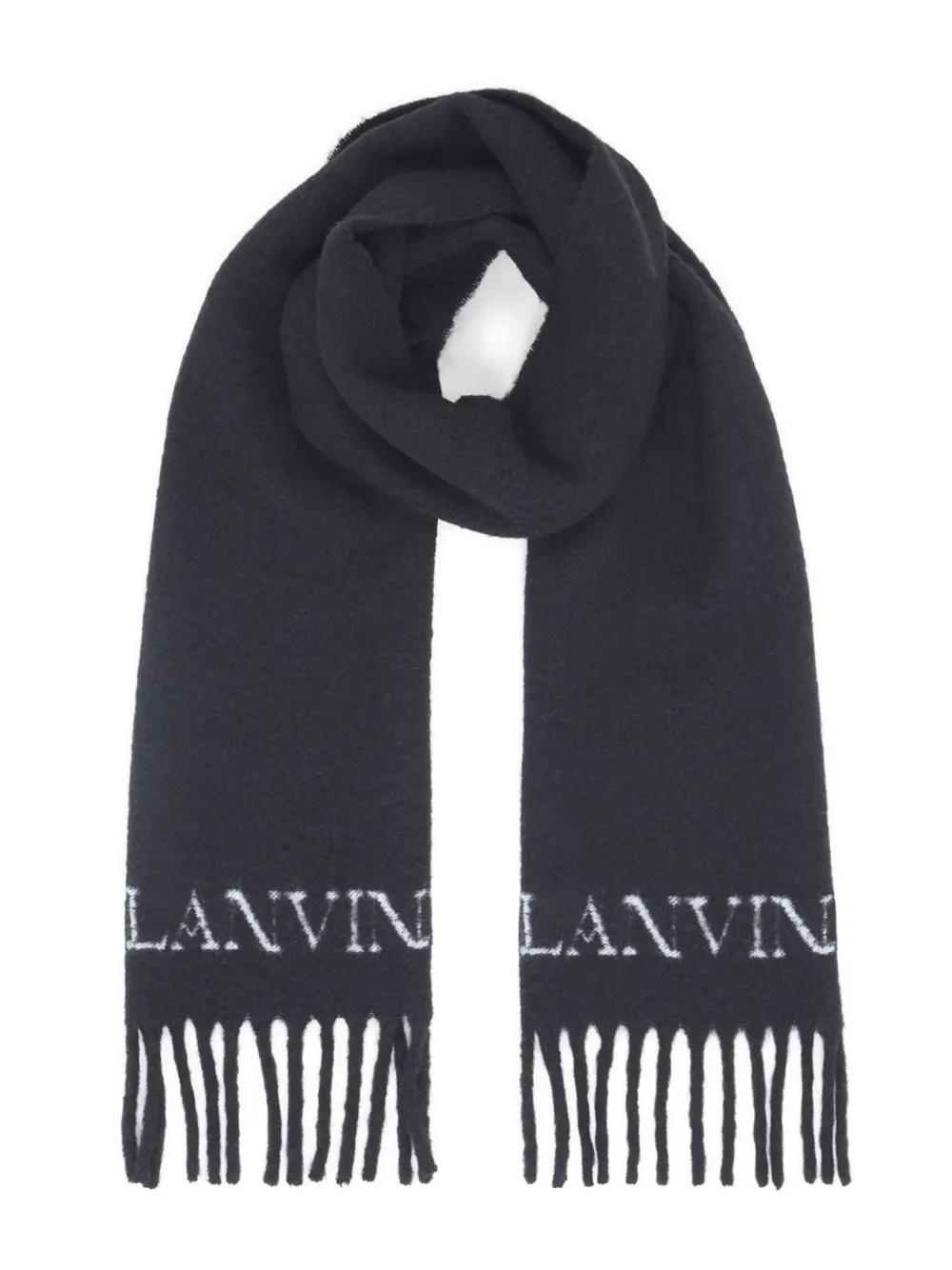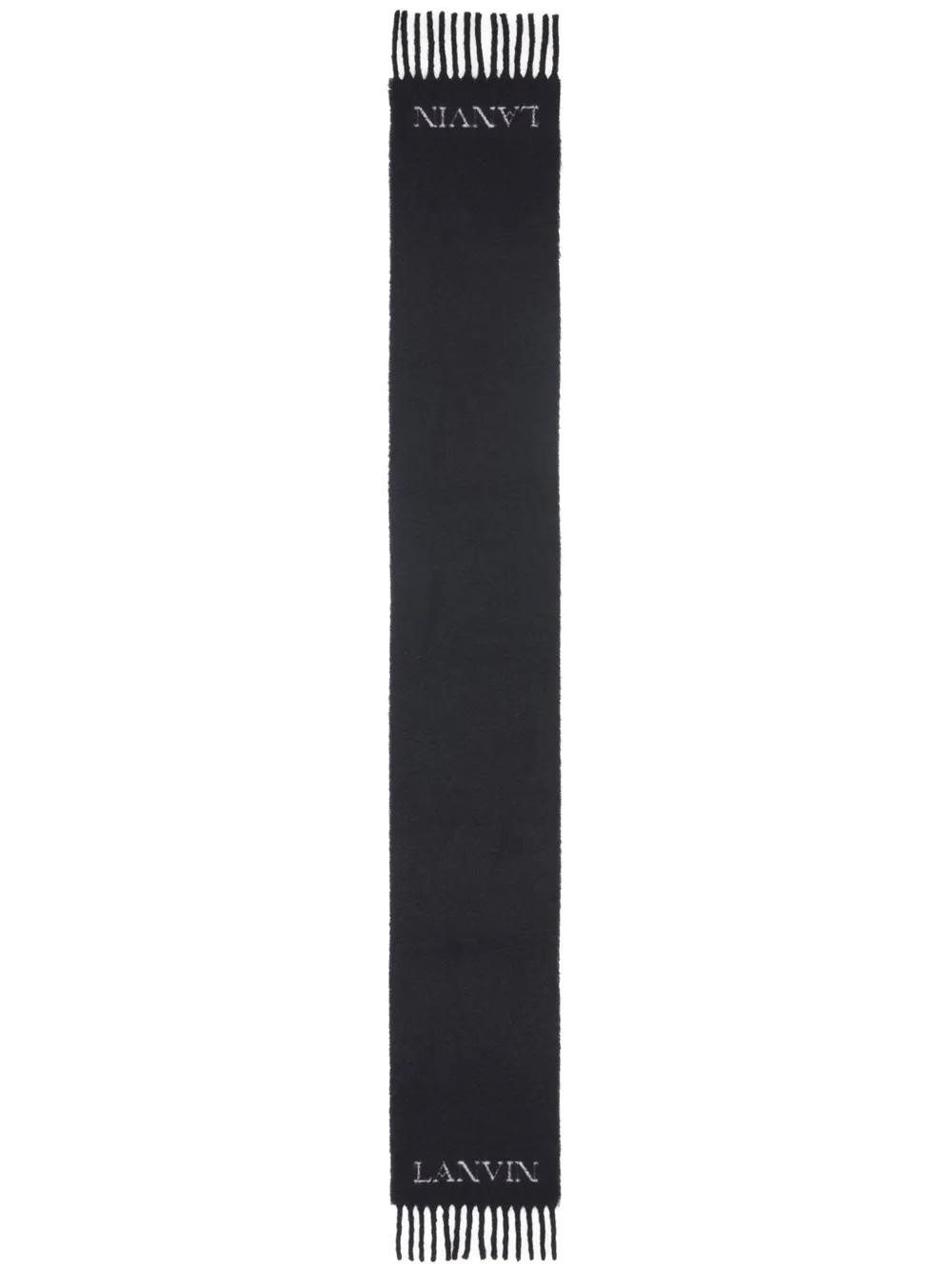 black knitted construction jacquard logo motif wraparound style fringed edge rectangle shape