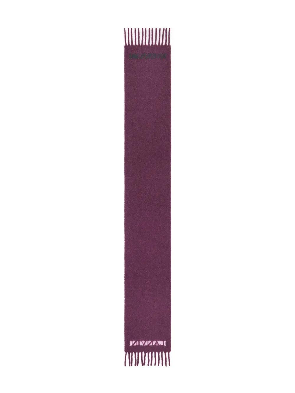 purple knitted construction jacquard logo motif wraparound style fringed edge rectangle shape