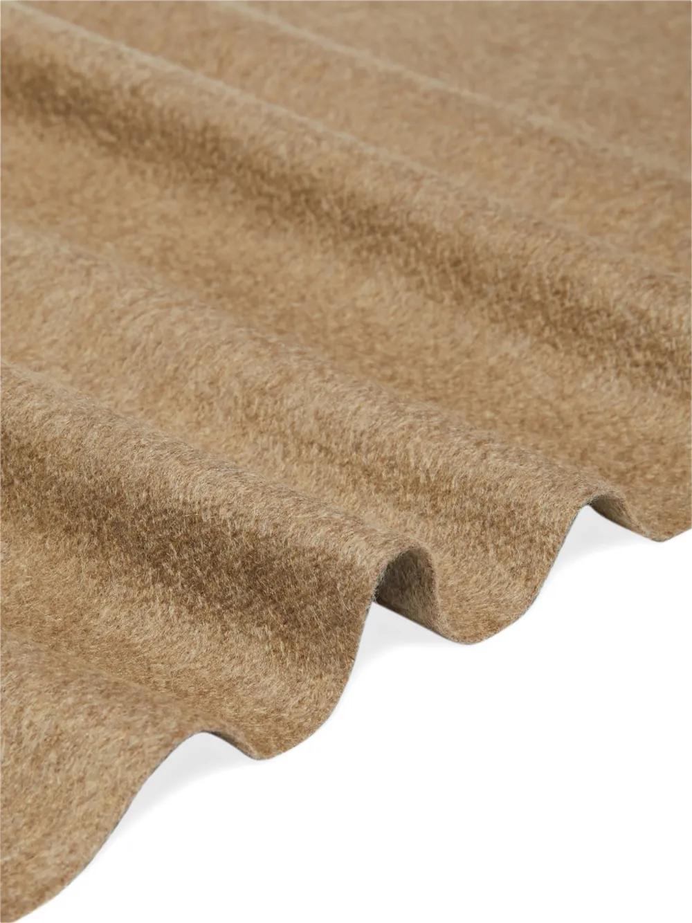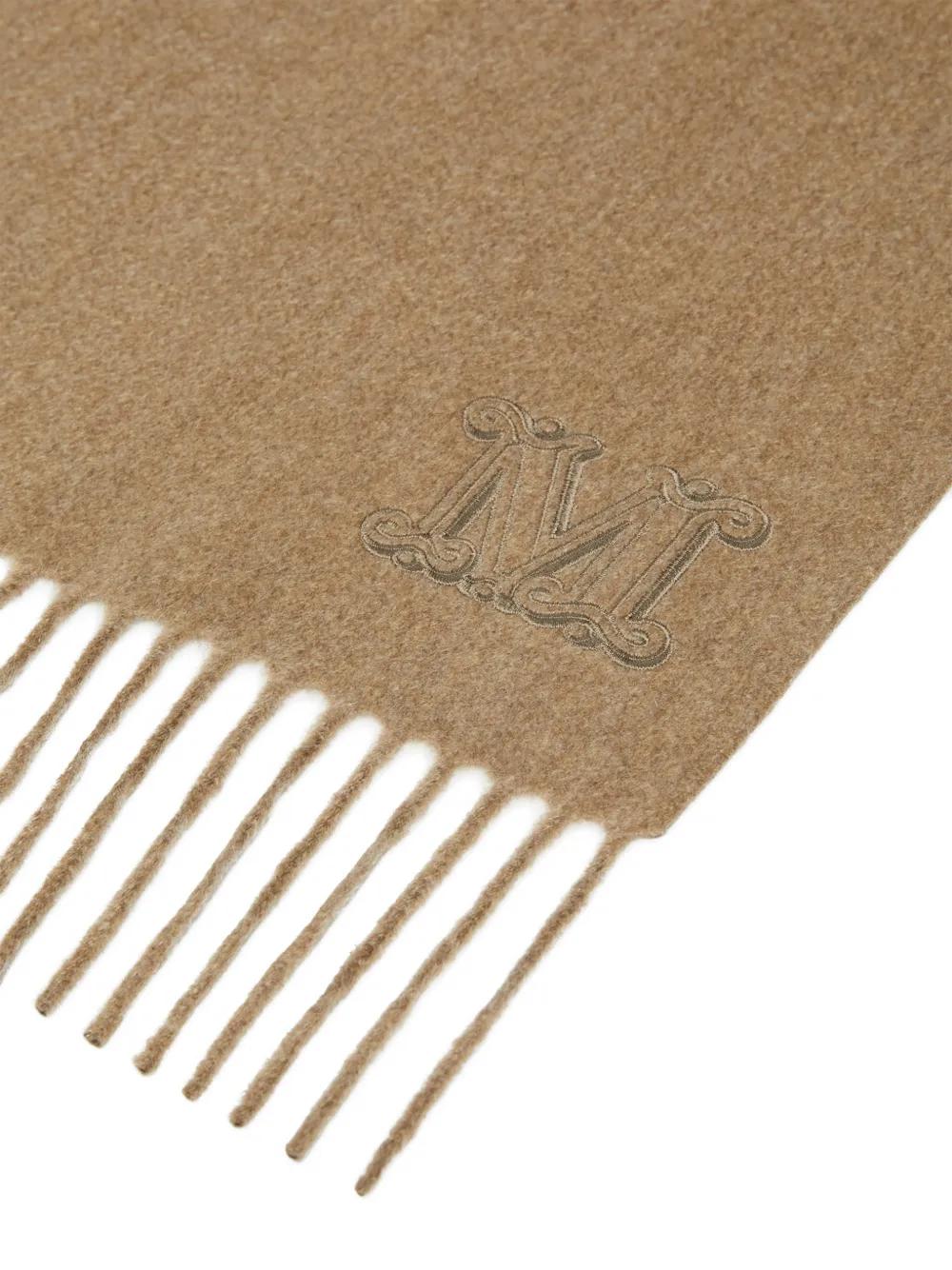 light brown virgin wool fine knit logo print to the front fringed edge rectangle shape wraparound style
