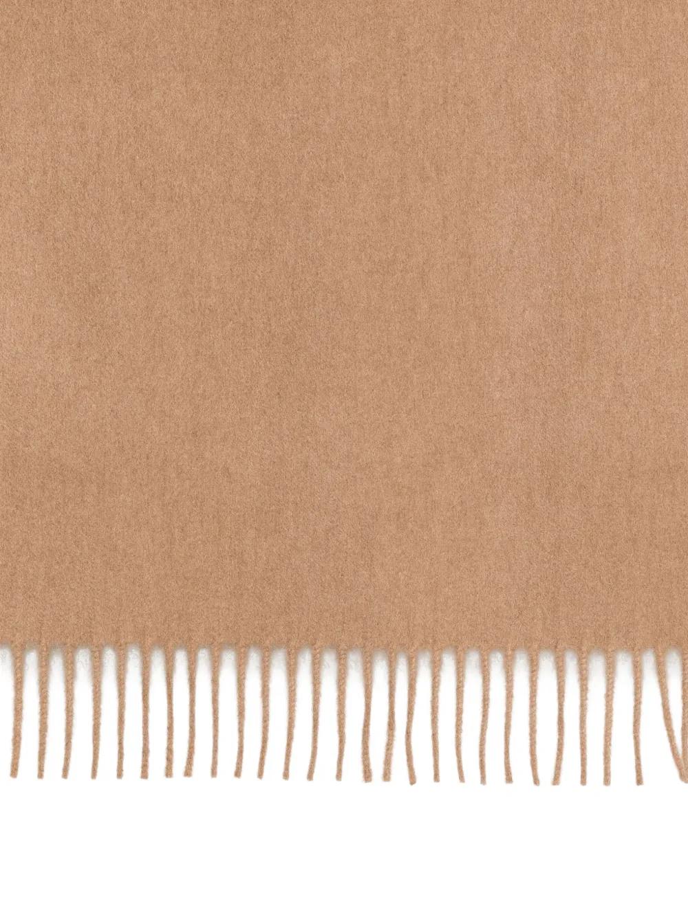 light brown virgin wool fine knit logo print to the front fringed edge rectangle shape wraparound style